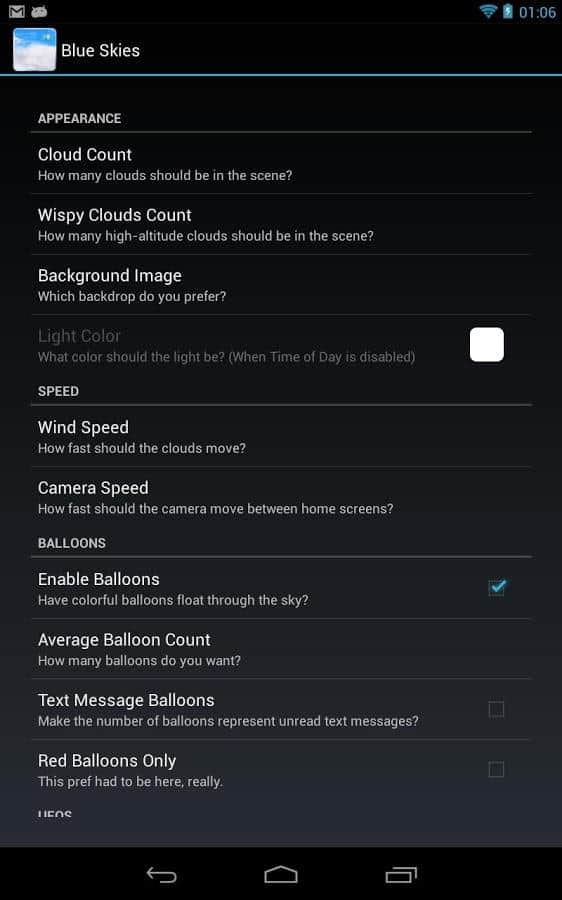 Blue Skies Live Wallpaper – самые легкие обои на свете от лучшего разработчика Kittehface Software для вашего андроид смартфона или планшета. Установите эти красивые обои на экран своего устройства и насладитесь полетом над облаками в любое время суток. Ночью вам будут светить луна и звезды, а днем яркое и приветливое солнце. Так же радует количество настроек, в которых есть возможность выбора: