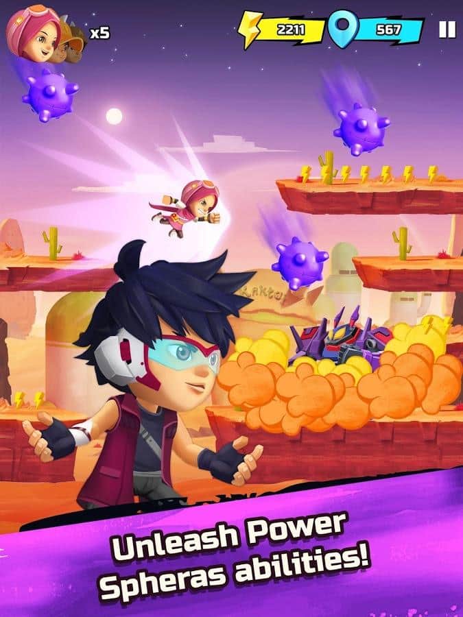 BoBoiBoy Galaxy Run: Fight Aliens to Defend Earth! – возьмите под свой контроль знаменитого героя и проведите его по опасным планетам. В этой игре вы будете управлять мальчиком, который обладает супер способностями и побеждает инопланетян. Наш герой отправился в опасное путешествие исследовать далекие планеты, на которых обитают инопланетяне. Управляйте бегущим героем и обходите все преграды на пути, заставляя его в нужный момент совершать прыжки и применять супер способности. Спасайте героев, которые попали в беду и соберите свою непобедимую команду. Открывайте для себя новые уровни и добивайтесь рекордных результатов.