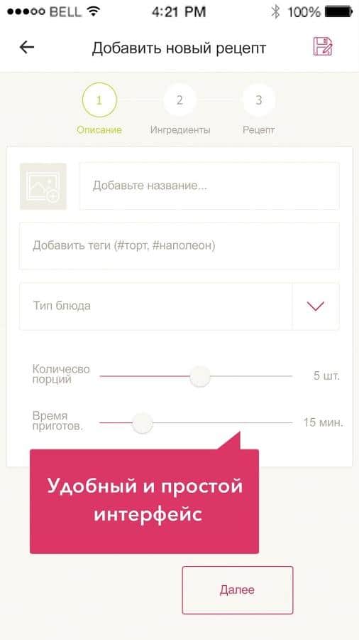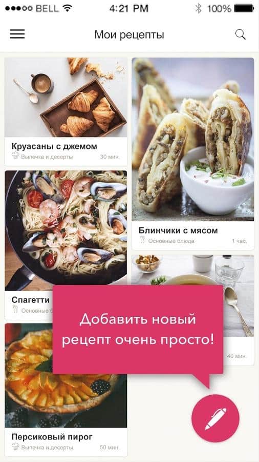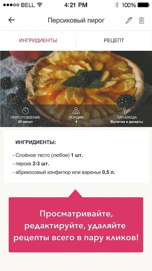 Большая кулинарная книга - вам будет удобно хранить собственные рецепты горячих и холодных блюд, напитков, закусок, десертов и т.д., а также добавлять понравившиеся рецепты от других пользователей и делиться ими с друзьями. Откройте в себе потенциал кулинарных способностей. Теперь вам не придется тратить время на переписывание рецептов в тетрадь, на листы бумаги или сохранять веб-страницы в закладки. Все блюда будут в одном надежном месте. Творите ваши "вкусные шедевры", украшая ими праздничный стол или романтический ужин. Ваши близкие по достоинству оценят непревзойденный вкус и оригинальное оформление.