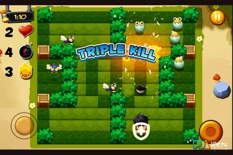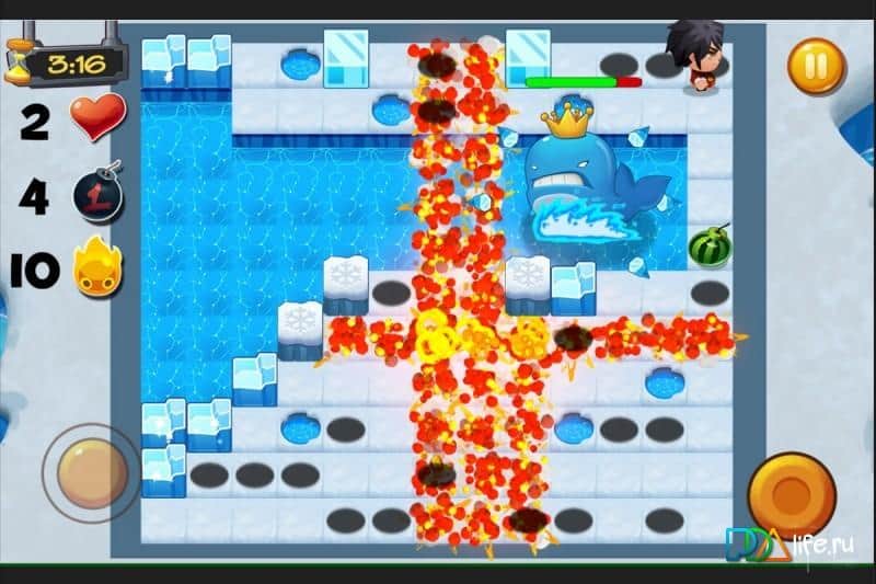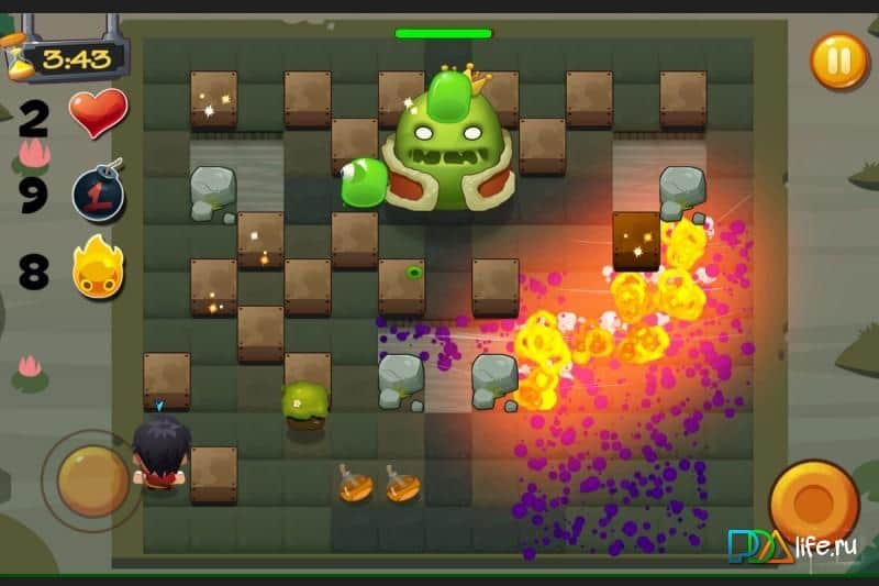 Bomber 2016 - Bomba game – увлекательная игра на андроид, где вам предстоит взрывать своих врагов с помощью бомб. В этой игре вы переместитесь в прекрасный сад, где вас будут подстерегать смертельные ловушки и враги. Вашей задачей будет за минимально короткое время поставить бомбы в нужном месте и уйти из зоны поражения, уничтожая только своих врагов. Играйте в одиночном или многопользовательском режиме и улучшайте своего героя по ходу игры, примеряя на него различную одежду и аксессуары. Собирайте нужные вам предметы и бонусы и торопитесь попасть в открытый портал и перейти на следующий уровень. Управляйте своим героем с помощью джойстика и специальной кнопки для установки бомбы.