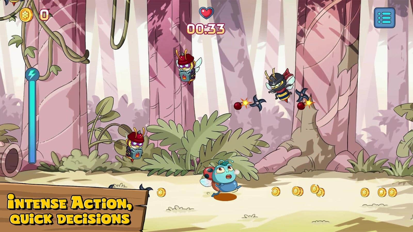 В игре “Армия шершней” вам предстоит помочь божьей коровке Джейкобу избежать мести королевы шершней и ее многочисленной армии. Пробегайте мимо падающих волн шершней, собирайте бонусы и используйте их для улучшения характеристик своего персонажа. Оттачивайте свои рефлексы, преодолевайте препятствия и наслаждайтесь захватывающим геймплеем!