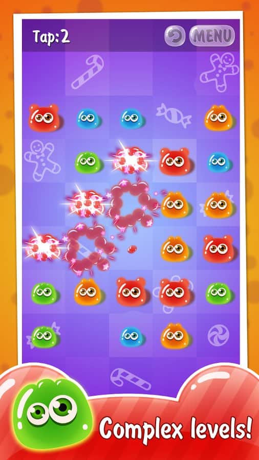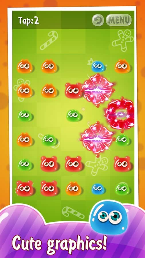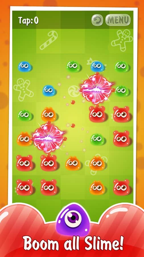 Boom Slime – игра из жанра три в ряд на андроид, где вы будете взрывать разноцветные желейные конфеты. Составляйте по три и более одинаковых конфет в ряд и взрывайте их, нажимая на них пальцем. Играйте в эту игру и наслаждайтесь веселыми взрывами и увлекательными заданиями. Запускайте в действие цепные реакции взрывов и применяйте многочисленные бонусы и усиления, чтобы как можно быстрее пройти уровни игры. Тратьте на прохождение игры меньшее количество ходов и получайте вознаграждения. Всего в игре представлено более 80 разнообразных уровней, 10 неповторимых достижений и приятная расслабляющая графика.