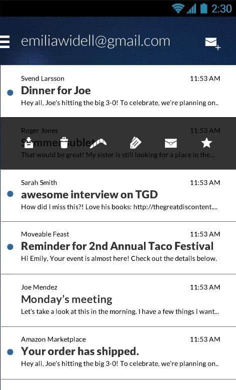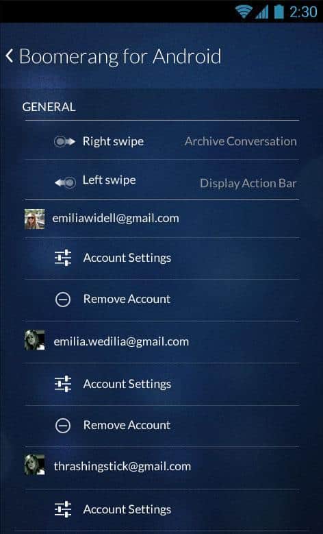 Boomerang – хороший почтовый клиент для андроид, который является расширением десктопной версии Gmail. Boomerang поддерживает различные темы оформления для почты, весьма функционален и содержит уникальную особенность повторного получения письма через заданное время, день, неделю, месяц и т.д. Благодаря такой возможности вы не пропустите и не упустите важные дела или моменты жизни! Приятного пользования!