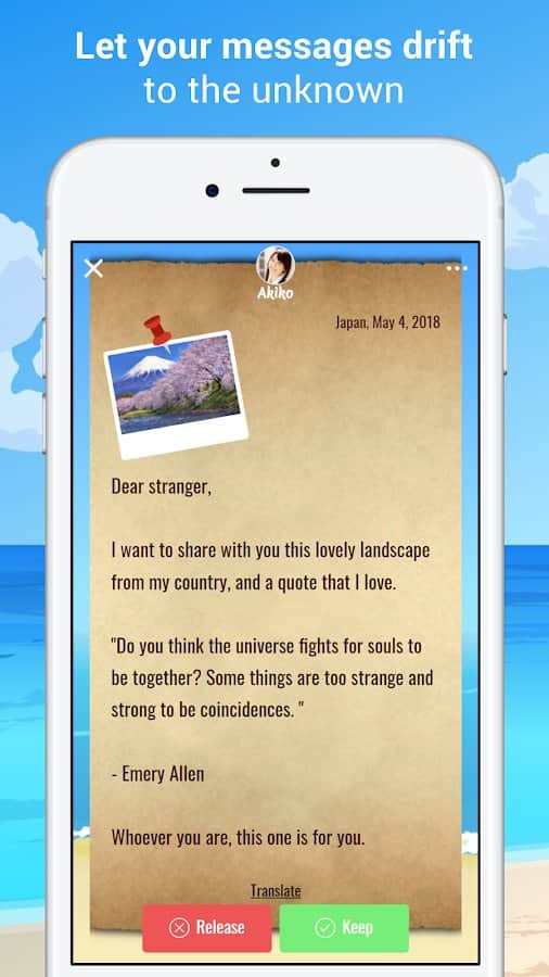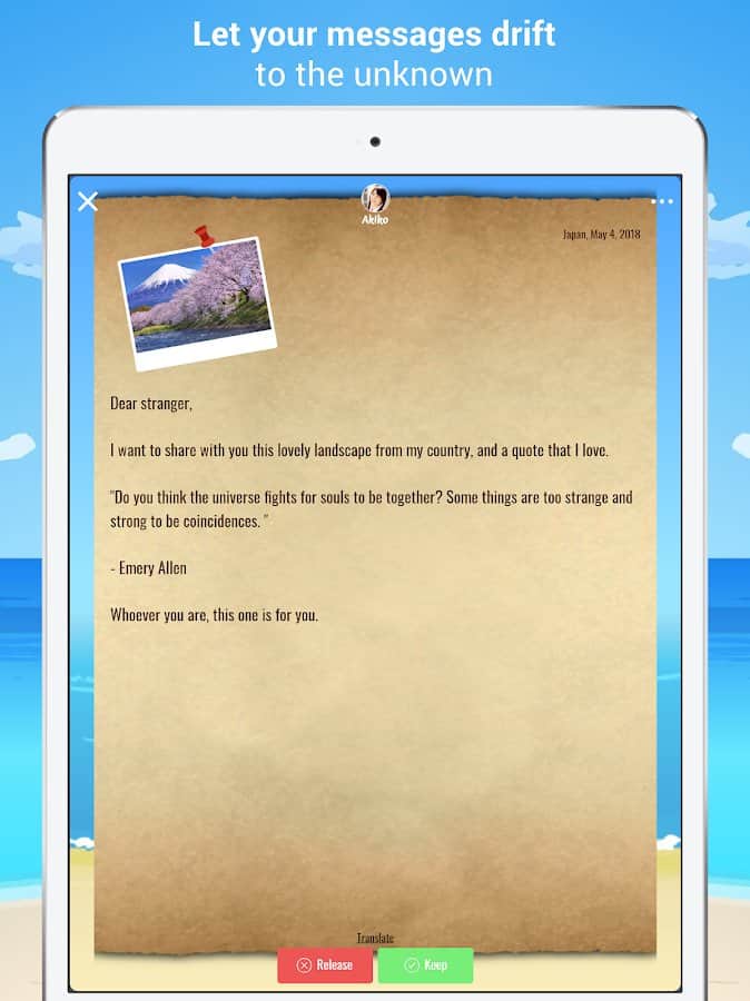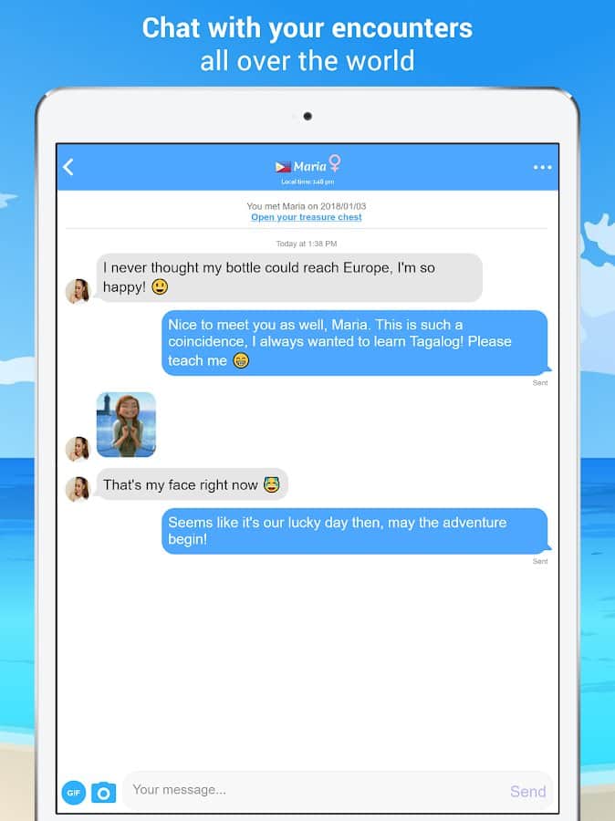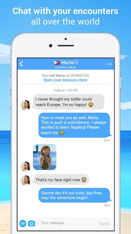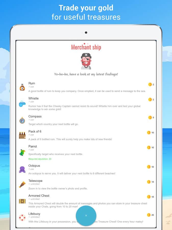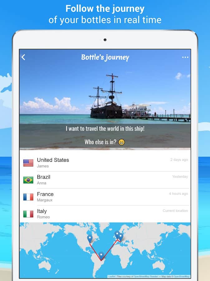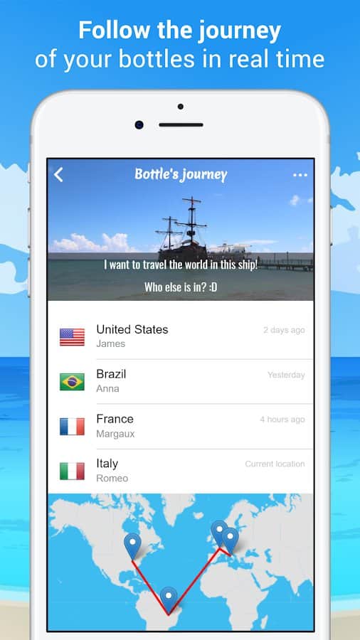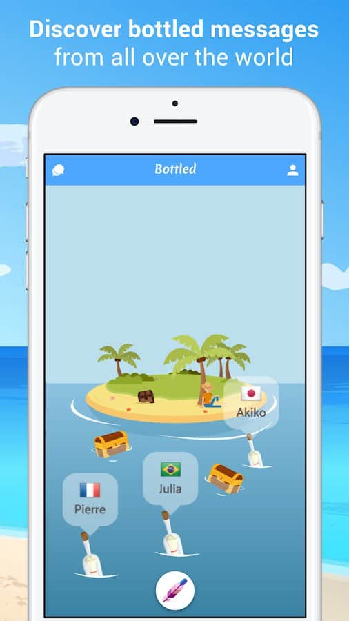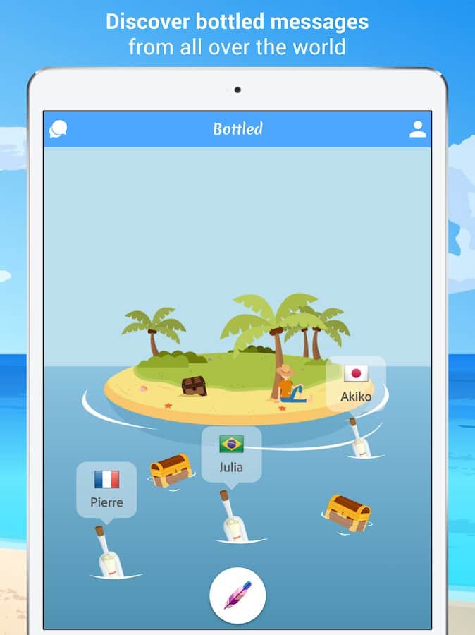 При помощи приложения Bottled - Message in a Bottle можно найти себе друзей, знакомых и даже вторую половинку, а также изучать иностранные языки и особенности культуры определенной страны. Посылайте свои сообщения оригинальным способом - в бутылке - кому-то одному или сразу восьми людям, используя опцию "Осьминог". В случае, если получатель сохранит ваше "послание", то впоследствии вы можете общаться с ним напрямую в реальном времени. Возможности: Отправка писем в бутылке неизвестным получателям в неизвестном направлении; Сохранение понравившихся сообщений в своем сундуке сокровищ; Отслеживание направления бутылки; Новый способ завести знакомства и отношения.