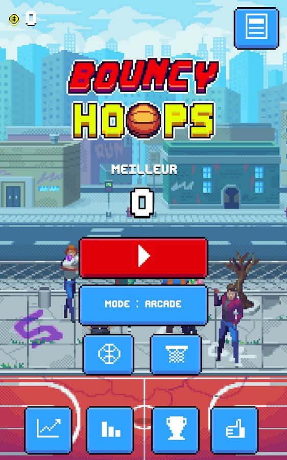 Bouncy Hoops - Это очень простой и забавный тайм киллер в котором вам нужно будет правильно рассчитать траекторию полета мяча. Управление в игре максимально простое и осуществляется при помощи всего одного пальца, вы можете жать в любую часть экрана что бы подбросить мяч немного выше. К тому же для разнообразия в игре будут меняться задние фоны и сами мячи. Собирайте монеты и получите свой уникальный баскетбольный мяч. Простаи и забавная эта аркада затянет вас надолго.