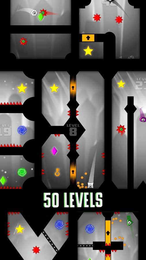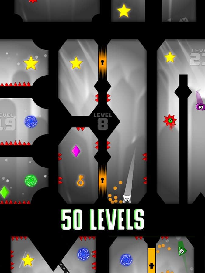 траекторию полета, чтобы обойти острые шипы и врагов и собрать свою коллекцию