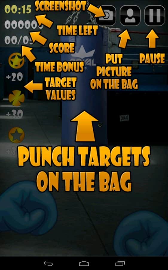 Boxing Bag - сумасшедшая игра, в которой вам необходимо отбивать свои кулаки на боксёрской груше. Весёлый тайм-киллер, в котором проводить время можно долго и беззаботно, особенно если прикрепить на груше фотографию вашего недруга. Да-да, такое возможно! Это наверное самая классная функция в игре. Приклеиваем фотографию и спускаем пар, настоящее развлечение для вас и ваших друзей. В игре предоставлены несколько видов груш и пара-тройка игровых режимов. Помимо обычного режима, есть режим компания в котором необходимо наносить комбинации ударов, для максимального эффекта. Также есть аркадный режим, в котором нужно бить точно в цель.