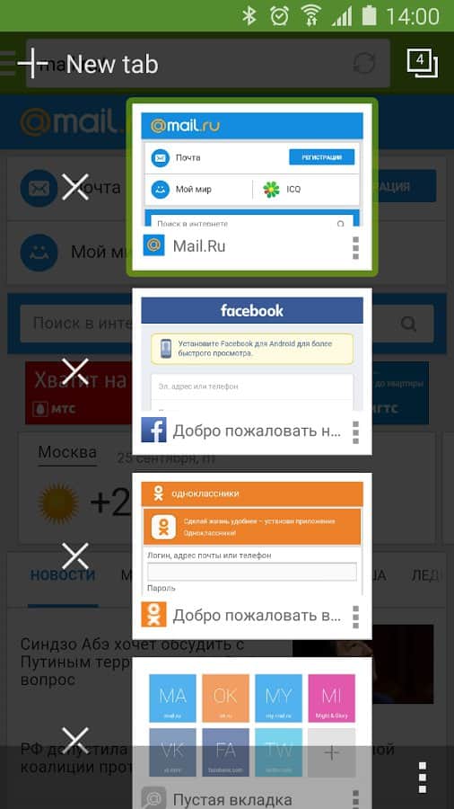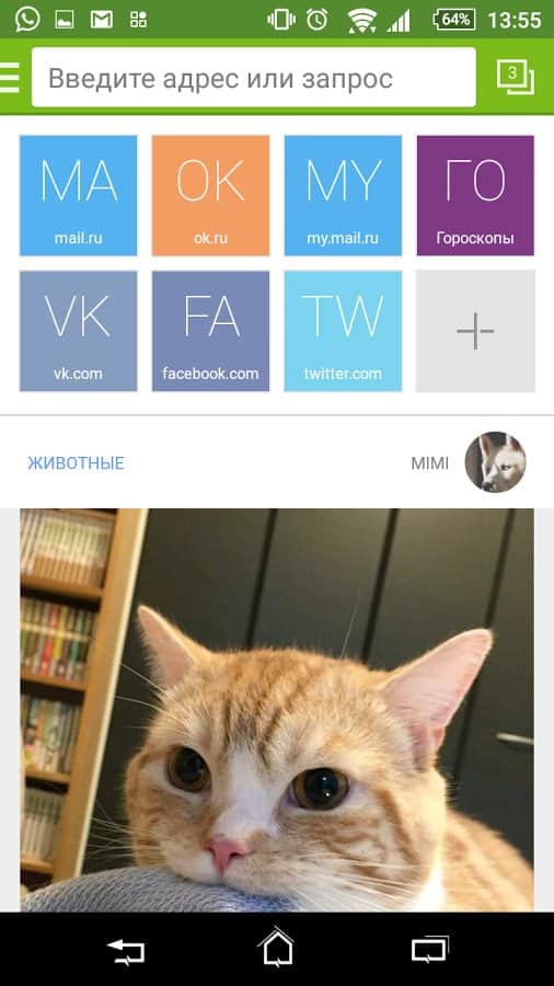 На главном экране браузера всегда под рукой ссылки на популярные сайты: Одноклассники, Twitter, Mail.Ru, Мой Мир, Вконтакте, Facebook, Спорт Mail.Ru и Афиша Mail.Ru.