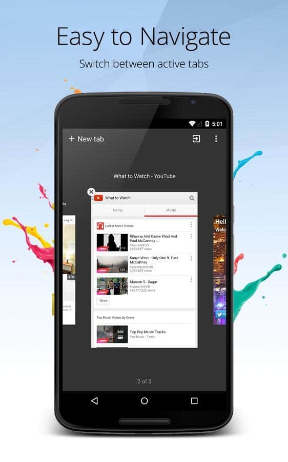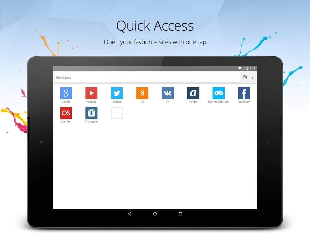 Разработчики браузера Orbitum для Android приложили все силы для того, чтобы те, кто будет работать с этой программой, испытывали исключительно положительные эмоции. Новый браузер особенно оценят пользователи социальных сетей. Прямо на домашней странице расположены иконки ВКонтакте, Facebook, Twitter, Instagram, Youtube. Панель быстрого доступа можно отредактировать вручную, однако браузер и сам добавляет в неё наиболее посещаемые сайты. В качестве поисковика по умолчанию используется Яндекс, но пользователь может поменять его на Google, Bing или DuckDuckGo.