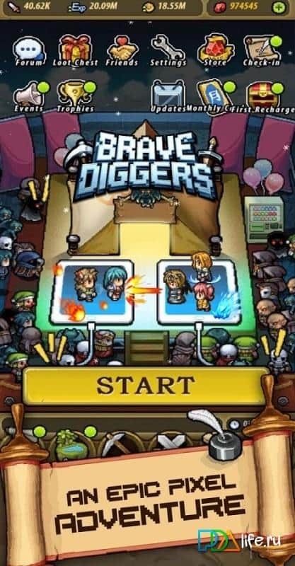 Brave Diggers - игра которую довольно трудно отнести к определенному жанру, ведь здесь присутствуют элементы ролевой игры, кликкера, копателя, градостроительного симулятора и это пожалуй еще не все. И так, вам предстоит начать с того что погрузиться в земные недра и нарыть для начала немного золота. Получив стартовый капитал можно отправиться в путешествие по внушительному игровому миру, по пути выполняя задания, убивая монстров, отыскивая тайники и конечно же заводя новые знакомства. Новоиспеченных приятелей можно подрядить на работы и тем самым увеличить добычу ценного метала, который опять же можно вложить в развитие предприятия. Таким образом вы вскоре можете стать настоящим магнатом, да к то муже обзавестись парой десятков друзей.