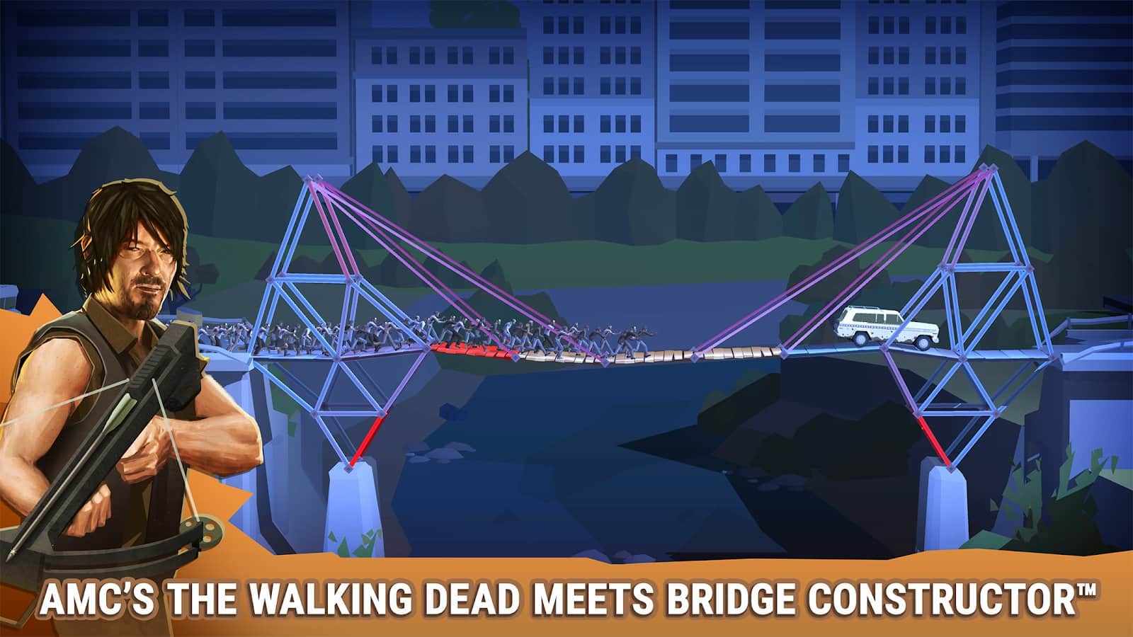 Bridge Constructor: The Walking Dead - всем известная механика игры по постройке мостов теперь во вселенной ходячих метрвецов. Вы во главе группы выживших которые из последних сил выживаются в мире полном зомби и просто агрессивно настроенных разбойников. Дэрил, Мишон и Юджин помогут вам в прокладывании безопасных маршрутов. Помимо этого ваши навыки потребуются и для того чтобы увести или уничтожить ходячих. В сухом остатке мы получили отличную коллаборацию отличной головоломки и сериала от AMC.