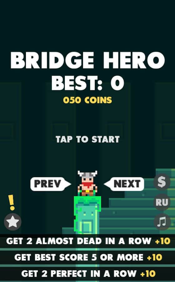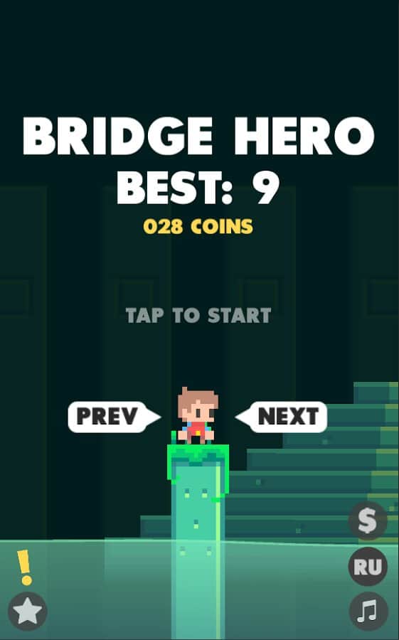 Bridge Hero – аркада на андроид, с кроткими уровнями, которая подойдет для игры в свободные минуты. В этой игре вашей главной задачей будет тапать по экрану своего девайса и перемещать героя по движущимся островам. Сложность заключается в том, что вам самостоятельно предстоит измерять длину моста до следующего острова, а если вы промахнетесь с длинной, то игра начнется заново. Проверьте свои силы и посмотрите, как далеко вы сможет зайти. Разблокируйте всех забавных персонажей и играйте понравившимся вам. Играйте и наслаждайтесь приятной музыкой и пиксельной графикой.