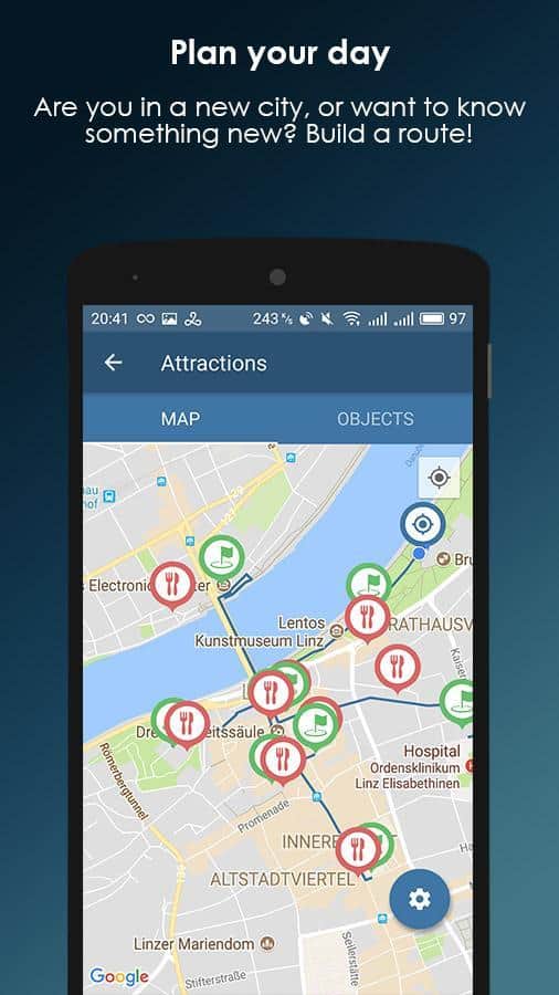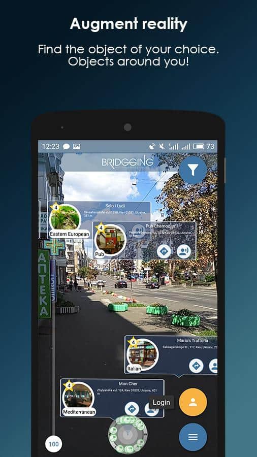 Bridgging позволяет обратить внимание на интересные объекты вокруг вас, показывая их в режиме камеры на вашем мобильном устройстве. Теперь любой путешественник сможет без труда найти кафе поблизости, чтобы перекусить. А выдающийся памятник архитектуры он ни за что не пропустит, и сможет рассмотреть его в малейших деталях. Более того, приложение позволяет пользователю добавить свой фотоснимок и отзыв об этом объекте. Вы можете внести в список собственный объект или трек, посмотреть добавленные треки других путешественников. Провести увлекательную экскурсию в черте города вам поможет функция "аудиогид", а также настройка определенного маршрутного листа.