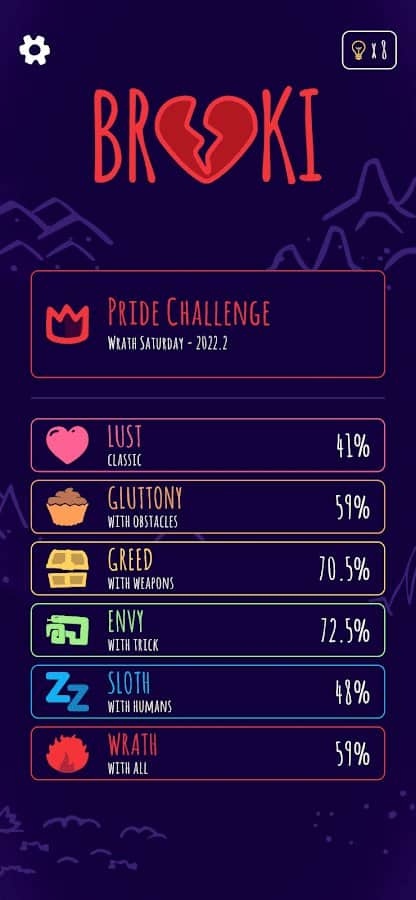 Broki - Грехи необходимо изгонять любыми способами, в вашем случае для этого понадобится пройти больше 1200 уровней, где расположены блоки в различных мирах. Для уничтожения зла вы можете выбрать определенные режимы игры, где будете разбивать демонов благодаря блокам. Участвуйте в популярных челленджах и ежедневных испытаниях, набирая как можно больше процентов для получения победы. Используйте подсказки, если не знаете как поступить дальше, но не переборщите с их использованием, так как количество ограничено.