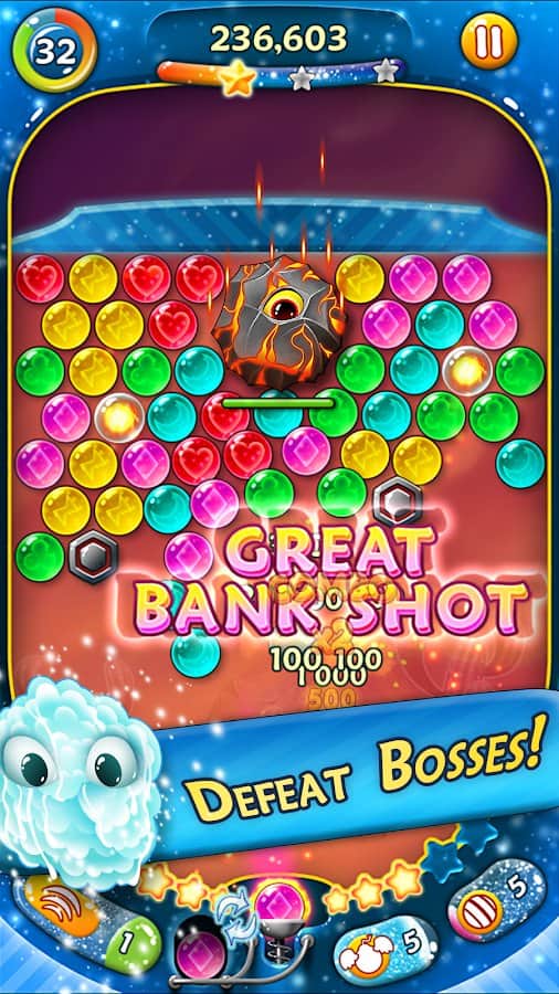 Bubble Bust! 2 – увлекательный бабл шутер на андроид, где вы будете стрелять разноцветными пузырями в скопление их на верху. Путешествуйте по шести удивительным и неповторимым мирам в сотнях разнообразных уровнях. Прицеливайтесь и стреляйте в скопление шаров на верху и применяйте многочисленные усиления и бонусы в виде летающих бомб, огненных шаров и других ускорителей которые позволят вам победить сильных боссов. Играйте в одиночном режиме или бросайте вызов реальным игрокам и друзьям побеждайте их и получайте высокие баллы.