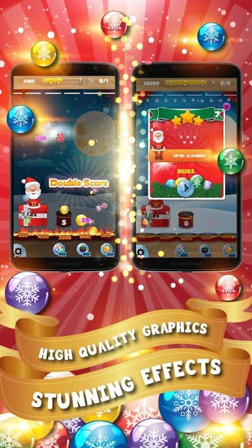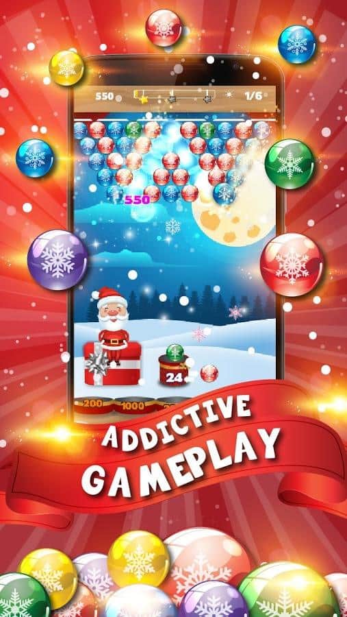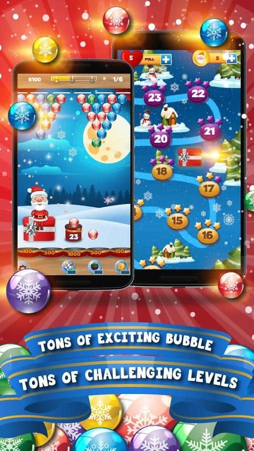 Bubble Shooter - Frozen Puzzle – казуальная игра на андроид, где вы будете помогать Санта Клаусу приближать новогодние праздники. В этой игре вашей главной задачей будет стрелять пузырями так чтобы, собрать группу из трех и более пузырей одного цвета. Стреляя пузырями вы будете помогать Санта Клаусу собирать все подарки в мешок. Метко стреляйте в скопление пузырей и взрывайте их, освобождая место для других одним выстрелом. Применяйте бонусы и усиления что поможет вам быстрее проходить уровни и получать больше очков. Игра порадует вас 56 разнообразными уровнями и рождественской обстановкой.