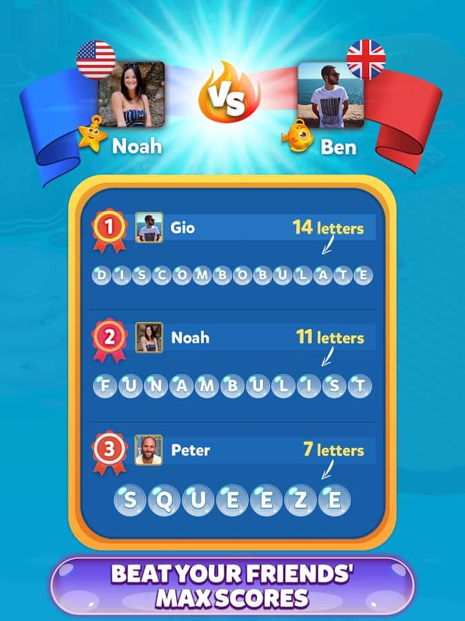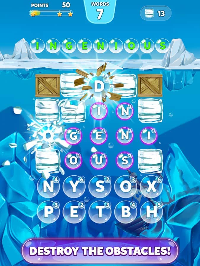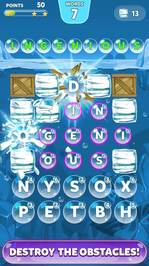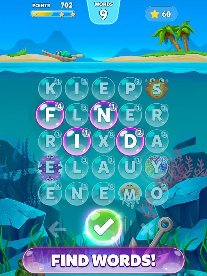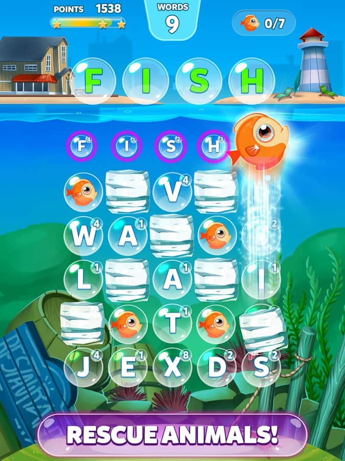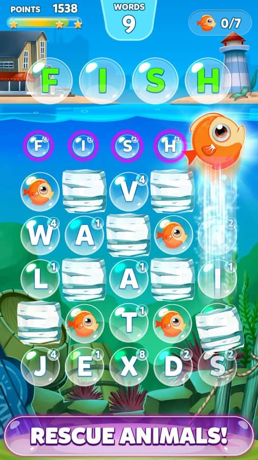 Bubble Words - Letter Splash – головоломка на андроид, которая перенесет вас в увлекательный подводный мир где вы будете из букв составлять слова. Выполняйте различные логические головоломки и составляйте как можно длиннее слово из представленных букв и набирайте максимальное количество очков. Составляйте слова, используя все буквы на экране вашего девайса в любом порядке. Тщательно продумывайте свои действия, не торопясь при этом, ведь количество времени у вас будет не ограничено. Составляйте слова и тренируйте свою логику, внимание и сообразительность. Применяйте различные усиления и бонусы, которые значительно упростят вам игру.