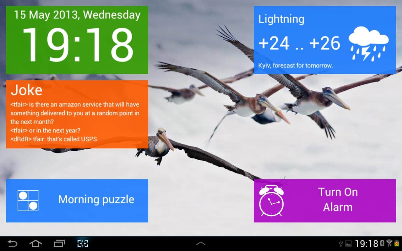Утром будильник покажет свежий анекдот, для поднятия настроения.