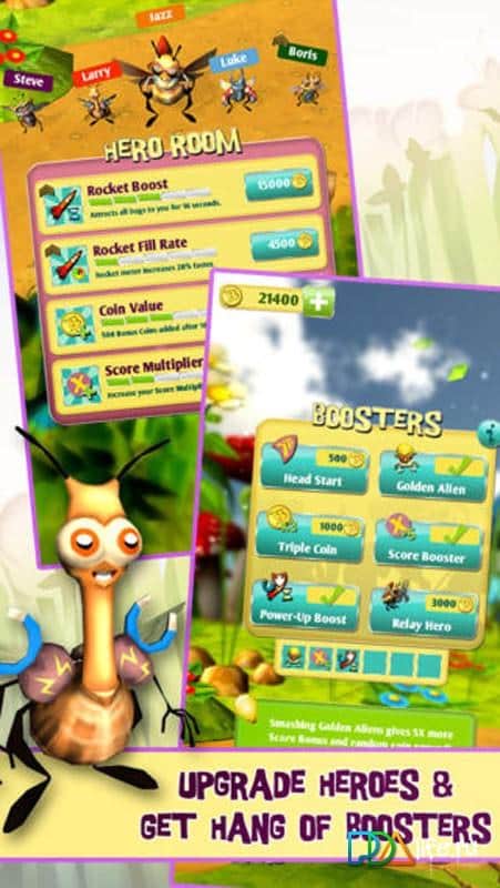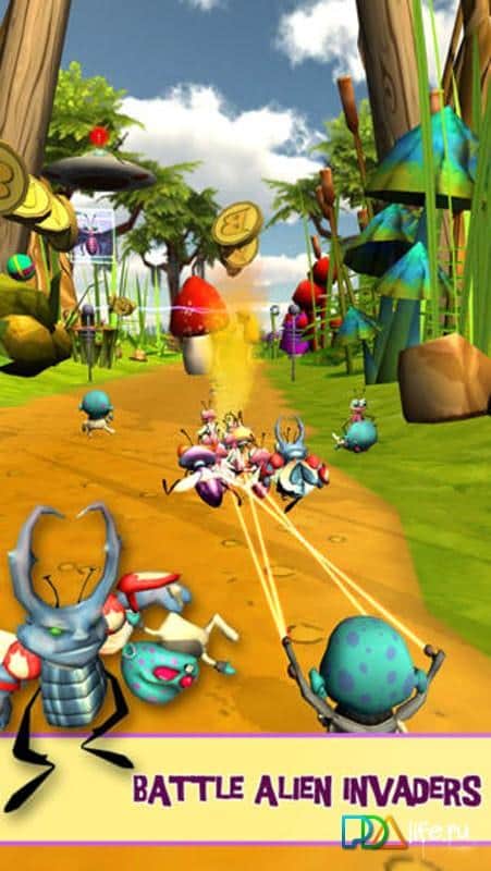 Bugs vs. Aliens - 3D-аркада с элементами экшена, в которой жуки будут бороться против инопланетных захватчиков. Враг силен и пустит в ход все свое оружие - плазменные лучи, веб ловушки, дайв-бомбы и пр. Ваша задача - несмотря ни на что, справится со всеми препятствиями и выгнать пришельцев со своих территорий! Не забывайте также про разбросанные везде бонусы, сбор монеток, а также освобождение из клеток маленьких букашек по пути! Яркая мультяшная графика, забавная озвучка и динамичный геймплей никого не оставят равнодушными!