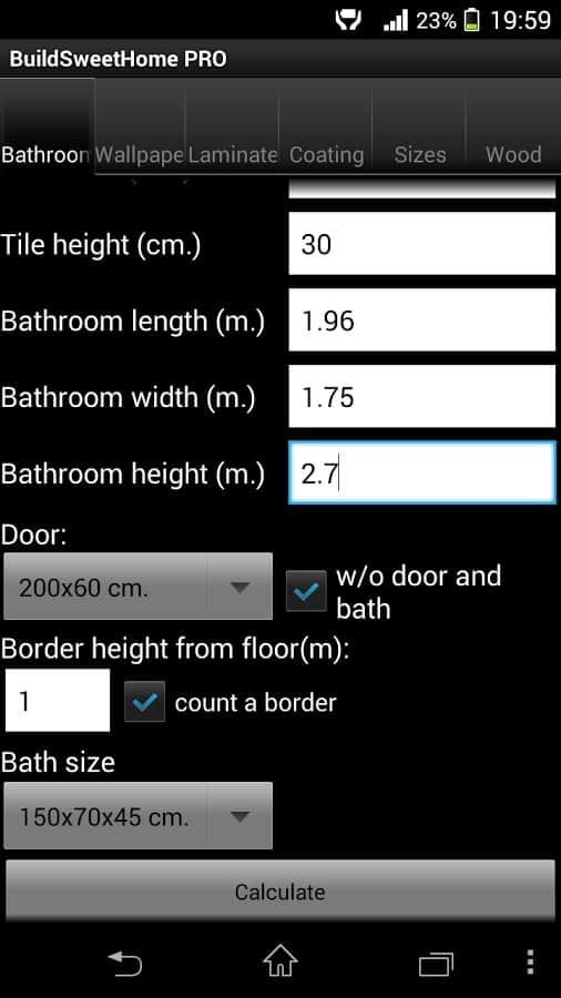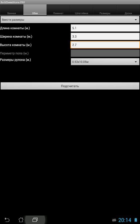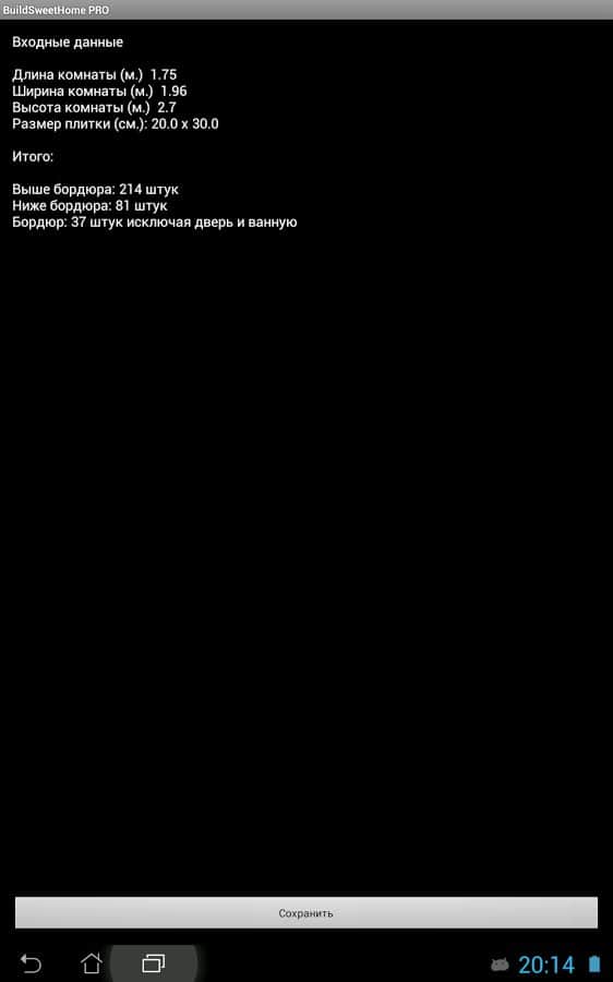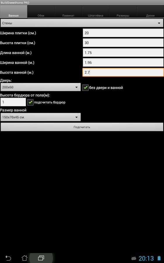 BuildSweetHome - полезная программа для андроид, своего рода калькулятор строительных материалов. Незаменимая программка для всех, кто ремонтируется - от подрядчиков до заказчиков. Вы сможете рассчитать количество необходимого материала - кафельной плитки, ламината, обоев, досок и пр. Кроме того, имеется возможность расчета количества 2х разных материалов, используемых в одном помещении, например, плитки 2х цветов в ванной. И еще много других полезных расчетов для ремонта с возможностью сохранить полученные результаты.
