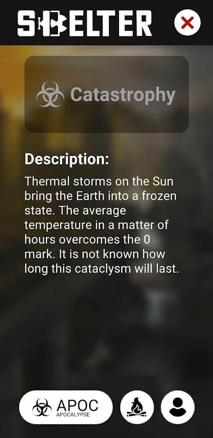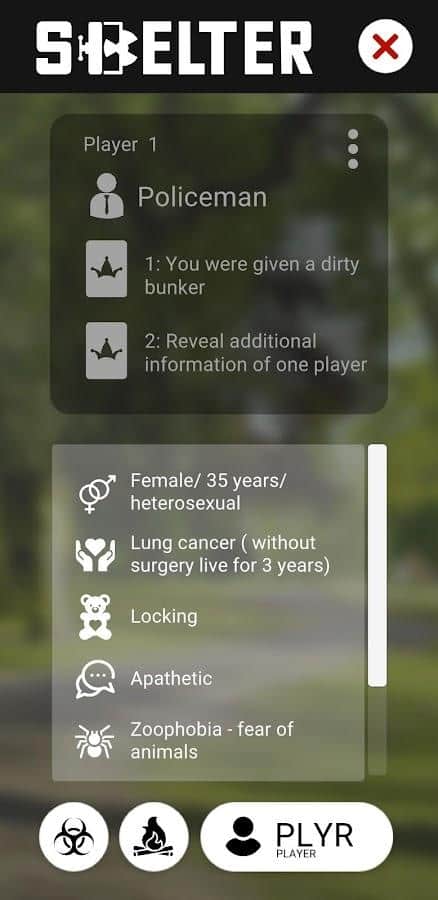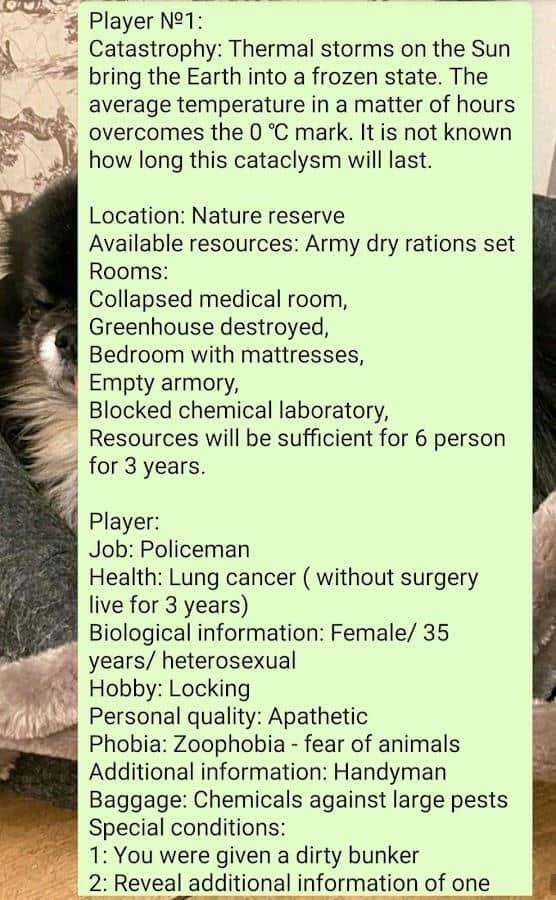 Бункер - Время Апокалипсиса никого не щадит, так и случилось в этот раз. На мир обрушилась новая катастрофа, которая доказала человечеству, что каждому человеку необходимо иметь важнейшие качества для помощи другим. Вы оказались счастливчиком и сразу оказались недалеко от Бункера, поэтому вы становитесь одним из тех, кто будет решать судьбу каждого выжившего. Для качественного отбора все игроки обязаны пройти особый тест, он покажет на что они способны. В следствии, у прошедших отбор будет уникальная карточка со всеми умениями и возможностями.