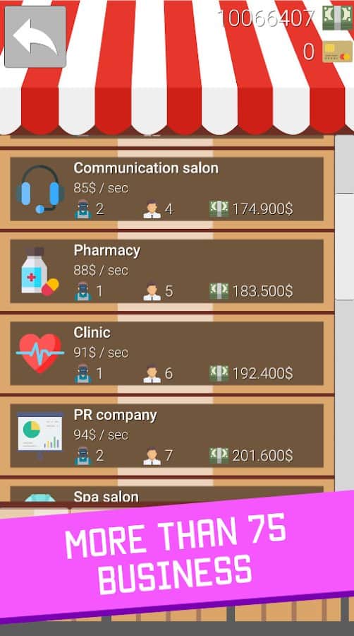 Business Clicker: Evolution – захватывающий кликер на андроид, где вы станете владельцем бизнеса. В этой игре вашей главной задачей будет стать бизнесменом и заработать свой первый миллион. Осуществи свою мечту стать миллионером в этой игре и докажите всем что вы лучший бизнесмен. Открывайте свой бизнес просто касаясь как можно чаще экрана своего телефона или планшета и заставляйте деньги работать на вас. В игре вы найдете множество подсказок и встроенных систем обучения, которые подскажут вам что нужно делать чтобы открыть бизнес. Для того чтобы открыть бизнес вам нужен будет стартовый капитал и работники. Приготовьтесь к тому, что все это будет приносить вам пассивный доход.