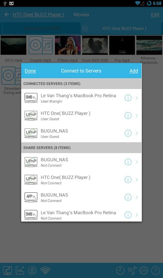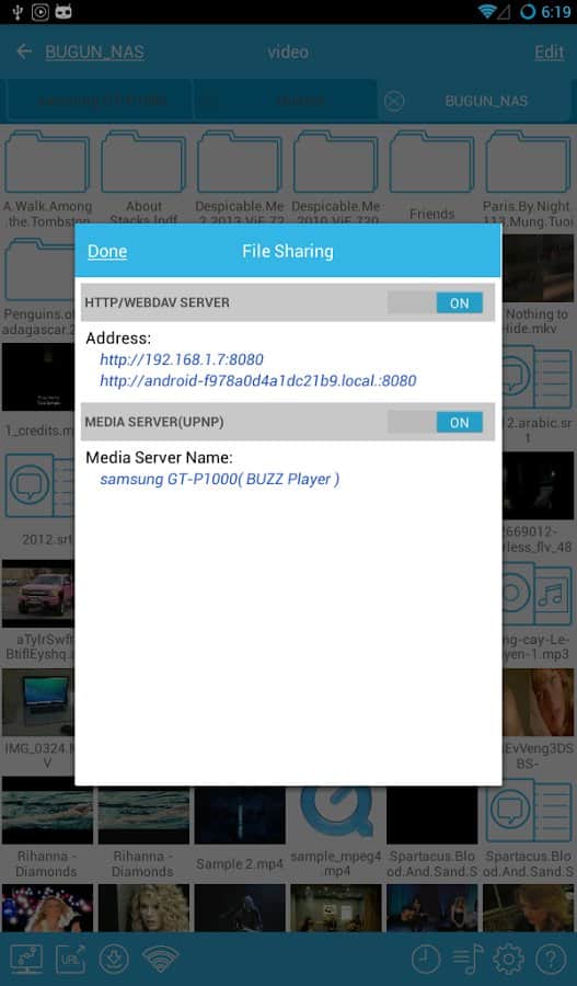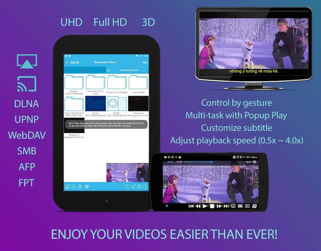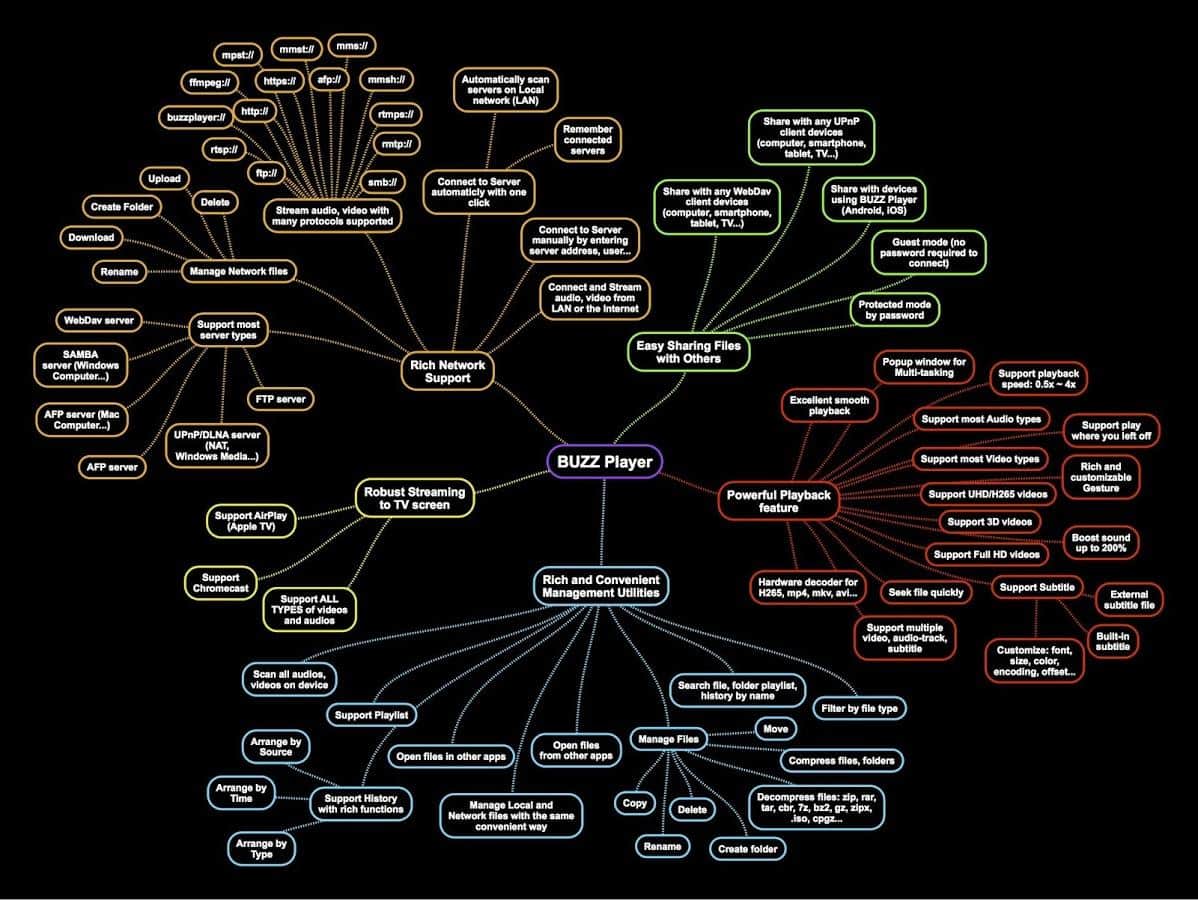 Мультимедийный проигрыватель Buzz Player для андроид поддерживает приличное количество кодеков. Вы найдете в программе богатый набор разнообразных функций. Приложение поддерживает субтитры на многих языках, среди которых английский, итальянский, вьетнамский, французский, японский, немецкий и др., а также разных типов — SRT, A * S, SSA, MSI и встроенные. Возможна самостоятельная настройка отображение субтитров при помощи изменения цвета, размера и типа шрифта. Также можно изменить время смещения и место. Программа позволяет смотреть фильмы с удаленных серверов и раздавать видеофайлы по сети. Эта функция возможна благодаря поддержке многих протоколов, в том числе RTP, RTSP, HTTP, FTP, MMS, Netstream (mpst://), SMB, ffmpeg://. Сетевой браузер, встроенный в Buzz Player, позволяет просматривать и копировать фильмы с компов ОС Widows/Mac/Linux.