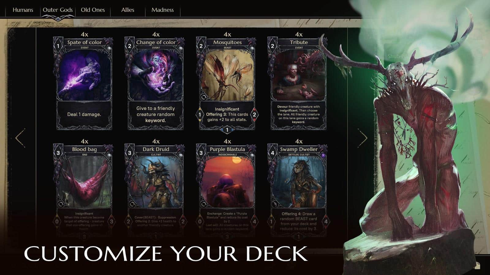 Call of Myth: Collectible Card Game - Какую сторону выберите вы: Защитника человечества или Безумных ужасов? Разработайте четкие стратегии по выигрышам в карточной игре, где находятся карты с уникальными способностями, проявляющимися в ходе игры. Стоит заметить, что у вас есть шкала здоровья, так и состояние здравомыслия. Если вторая шкала упадет до 0, то есть шанс что ваше существо станет неадекватным. Научитесь сочетать удивительных персонажей и обдумывайте как именно будете действовать в той или иной ситуации, чтобы вовремя сделать решительный шаг.