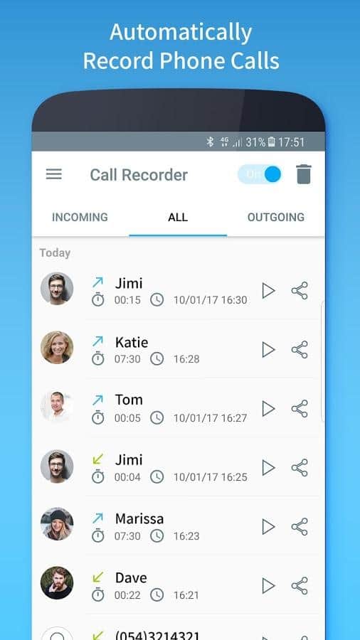 Call Recorder - Automatic - премиум - версия приложения которое позволит вам быстро и просто записывать телефонные звонки, при этом всего лишь необходимо выбрать звонок, входящий или исходящий, по номеру или контакту в телефонной книге и нажать запись. Создатели приложения постарались максимально упростить работу с уже имеющимися записями по средствам сортировки по группам, именам, датам. Так же вы легко сможете обмениваться файлами. Стоит отметить и еще интересную возможность автоматической записи всех звонков, что заметно облегчит работу с данными.