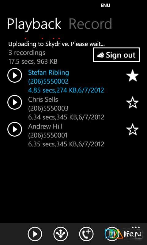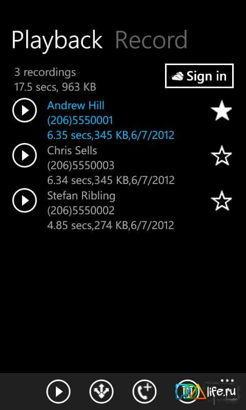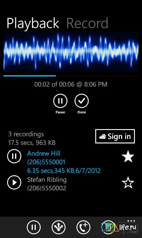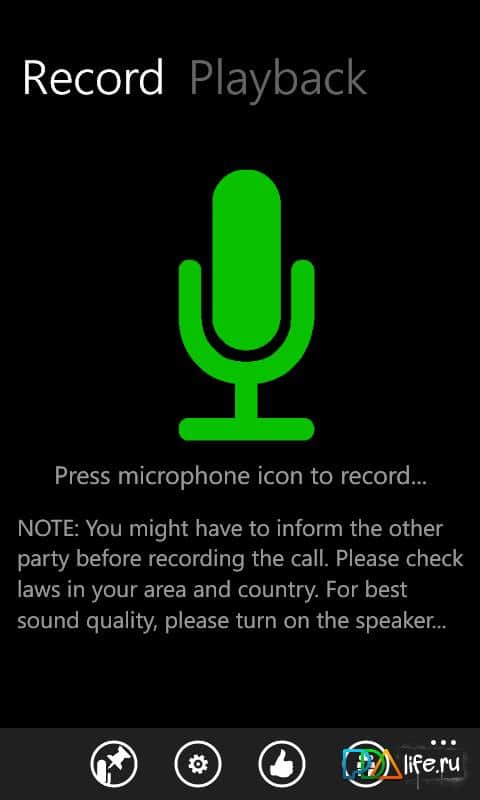 Call Recorder Pro - программа для записи телефонних разговоров на windows phone 7. У Вас есть возможность выбоора формата записи (AMR, WAV) и место, где будут храниться записи (память телефона или карточка), а также Вы можете установить максимальное время записи или сделать его неограниченным. Одна из особенностей программы – возможность использования правил, т.е. установить реакцию программы на входящие и исходящие звонки с определенных номеров, по маске номера или, к примеру, для всех неопределившихся номеров. Так же Вы можете управлять приложением в ручную: в этом случае программа будет спрашивать, нужно ли произвести запись этого разговора.