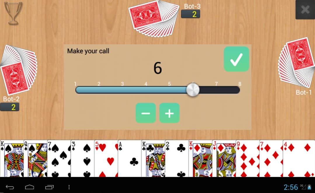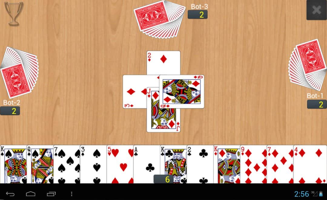 Callbreak Multiplayer – карточная игра на андроид, в которую вы сможете играть с игроками со всего мира или со своими друзьями. Игра начинается с того что каждому игроку выдается определенное количество карт из колоды 52 карты. Одновременно играть в эту игру могут до четырех человек, каждый игрок берет из колоды по одной карте и раскладывает их на столе. В этой игре вашей главной задачей будет скинуть все карты быстрее своих соперников и выиграть раунд. Применяйте козыри в сложных ситуациях и прокладывайте свой путь к победе.