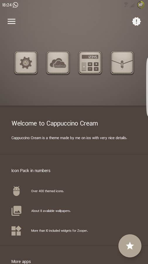 Cappuccino Cream - Красивые иконки и обои для вашего рабочего стола. Кофейный стиль данных иконок и обоев понравится тем кто любит кофе и его стиль. Все иконки сделаны в однотонном темном стиле и смотрятся весьма элегантно. К тому же данное приложение поддерживается на большинстве современных лаунчеров, так что у вас не будет проблем с его запуском.