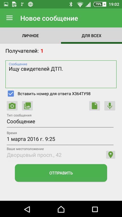 Так же есть возможность отправки сообщений на конкретный номер, на номера автомобилей, находящихся рядом, или находившихся рядом с конкретным местом в определенный момент в прошлом, последнее же будет весьма полезно в поиске свидетелей ДТП. Скачиваем, пробуем и делимся впечатлениями в комментариях.