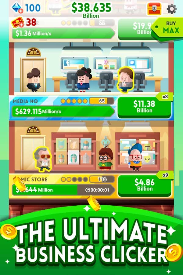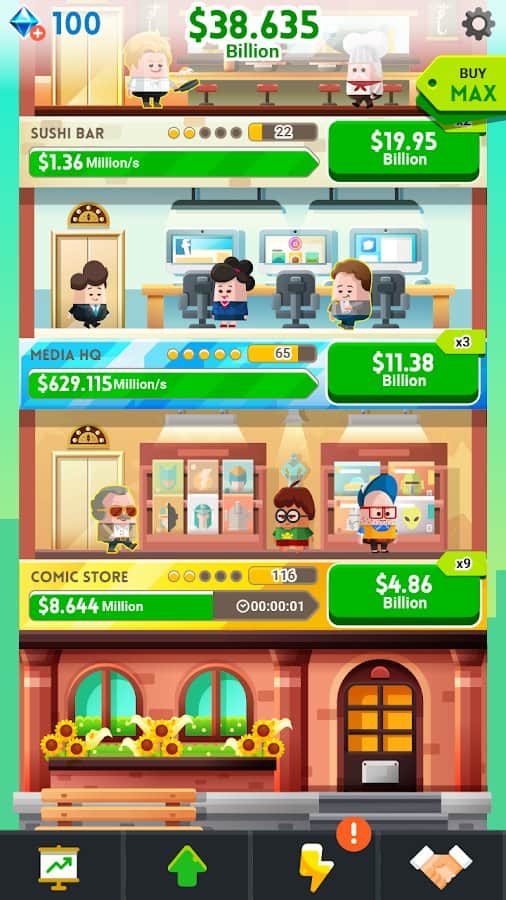 Cash, Inc. Fame & Fortune Game – увлекательная игра на андроид, где вы будете зарабатывать свои первые миллионы. В этой игре вам выпадет отличный шанс заработать славу и стать самым популярным и известным магнатом в мире. Нажимайте на экран своего телефона или планшета как можно чаще и зарабатывайте кучу денег. В игре вы будете использовать богатых супер звезд для того чтобы заработать на них как можно больше денег в свой карман. Наблюдайте за тем как растет ваше состояние и дайте деньгам вскружить вам голову. Зарабатывайте деньги и обновляйте свою бизнес-башню чтобы она была красивой и высокой.