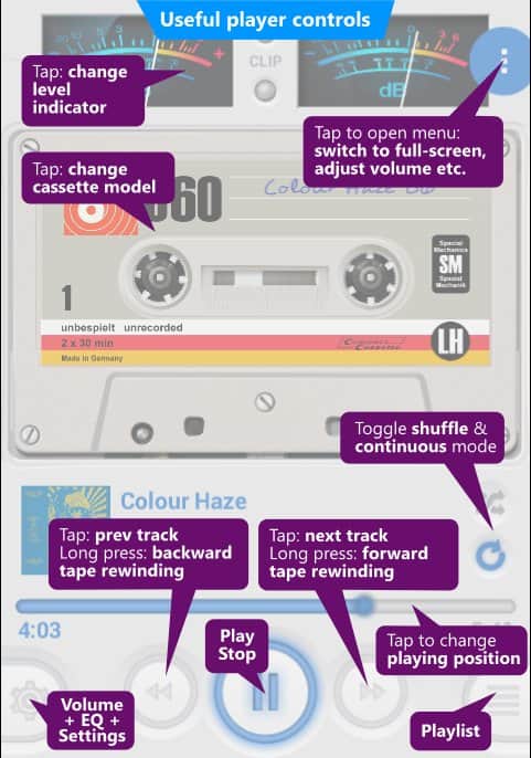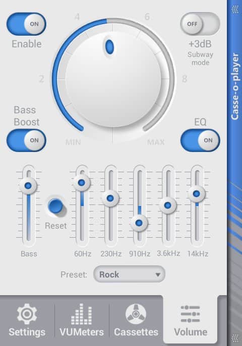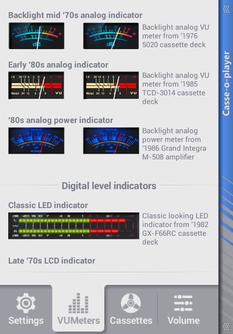 Casse-o-player – Хороший аудиоплеер, для тех, кто ещё помнит, что такое кассетный магнитофон. Создавалось оно именно в память о них. Исполнено в простом, но весьма красивом стиле, где в центре вашего экрана будет располагаться кассета. Все они созданы с весьма тщательным вниманием к деталям, а так же полностью анимированы. Поддерживает большинство современных аудио-форматов, а так же имеет много детальных настроек.