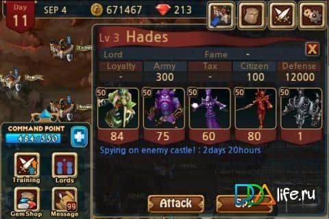 Сразите орды зла и установите законного правителя замка. Используя мастерство шпионажа перебазируйте войска и изменяйте ход сражений! Чтобы заполучить абсолютное оружие – Меч Зевса! овладейте сердцем дочери самого Зевса. Так же в игре имеется возможность улучшения отношений с жителями и руководителями замков при успешном поиске продавцов оружия, брони, колец и зелий для замка!