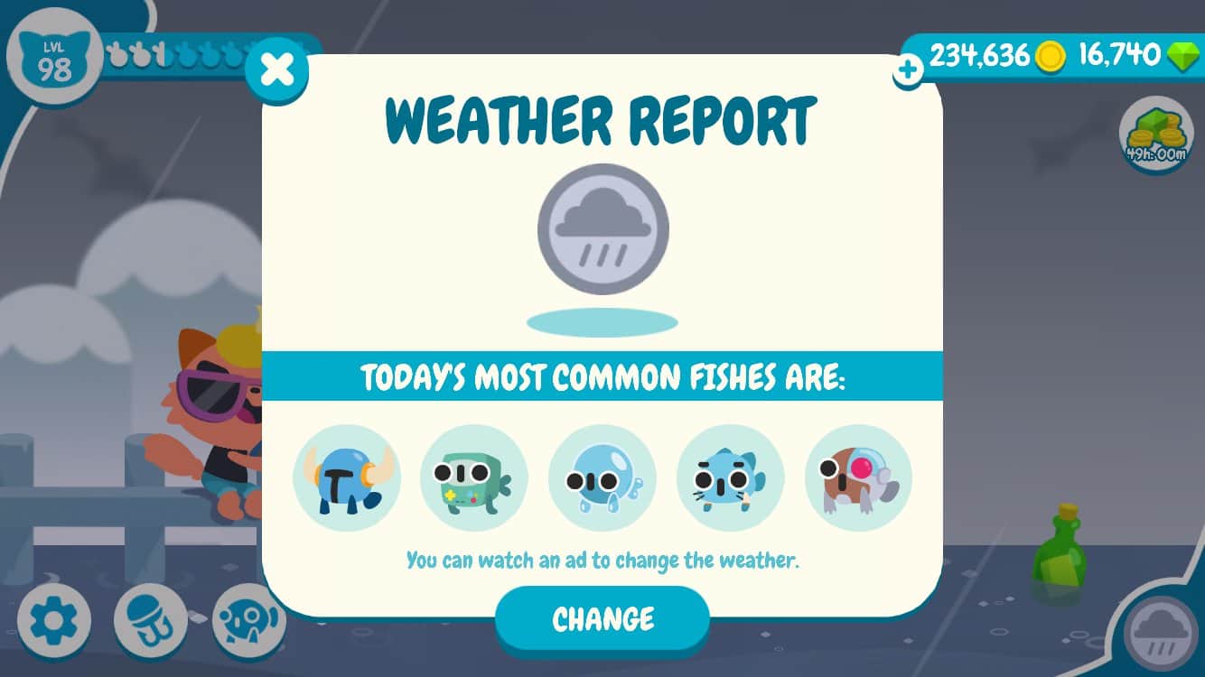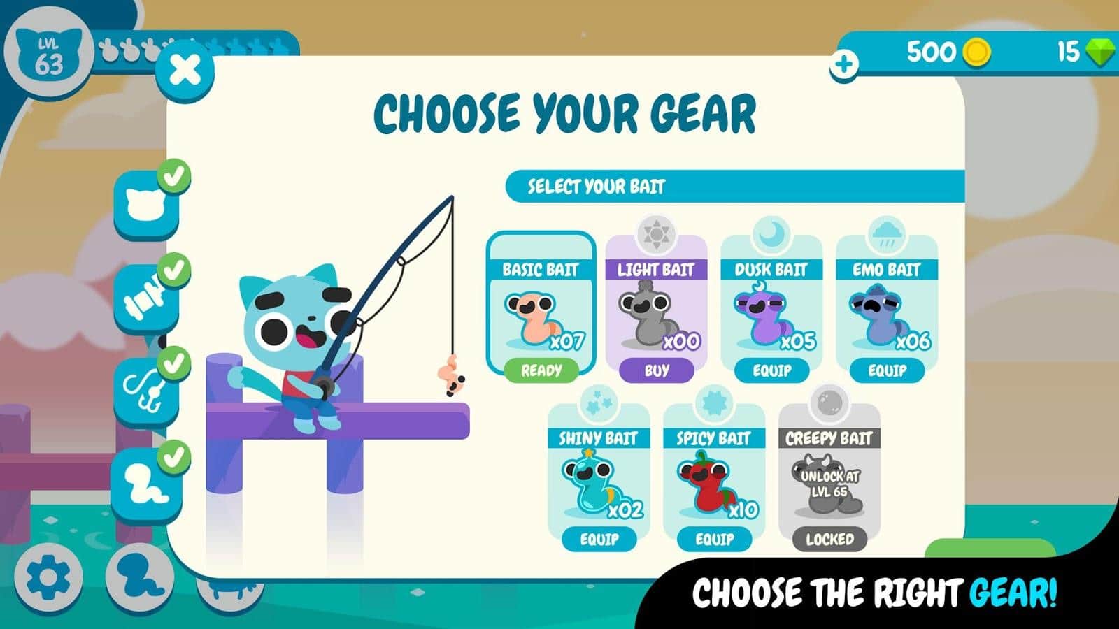 CatFish – увлекательная игра на андроид, где вы будете помогать милым котятам ловить рыбу. В эту игру вы сможете играть в любое свободное время, когда захотите расслабиться и весело провести свободные минуты. Выбирайте себе наживку из предложенных в игре снастей, закидывайте крючок в воду и ловите уникальных рыбок, пополняя свою коллекцию неповторимыми видами. Рыба вам нужна только для коллекции, ведь ваши котята вегетарианцы. Проверяйте погоду перед тем как отправиться на рыбалку, ведь некоторые виды рыб любят определенные погодные условия. Подбирайте правильную наживку и ловите только тех рыб, которые нужны вам для коллекции.