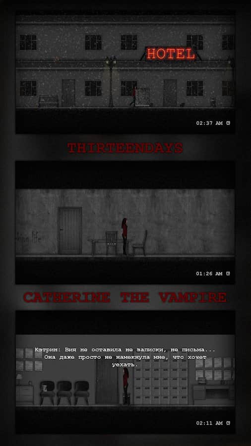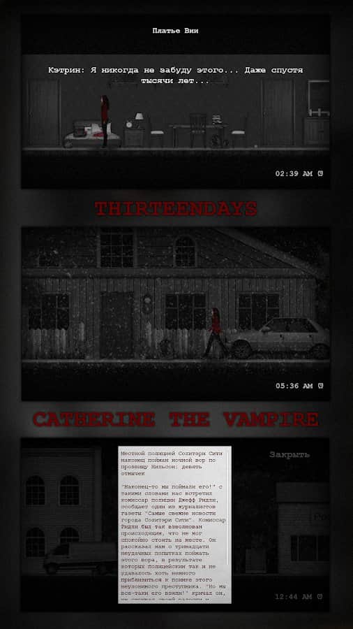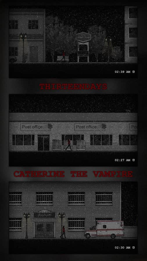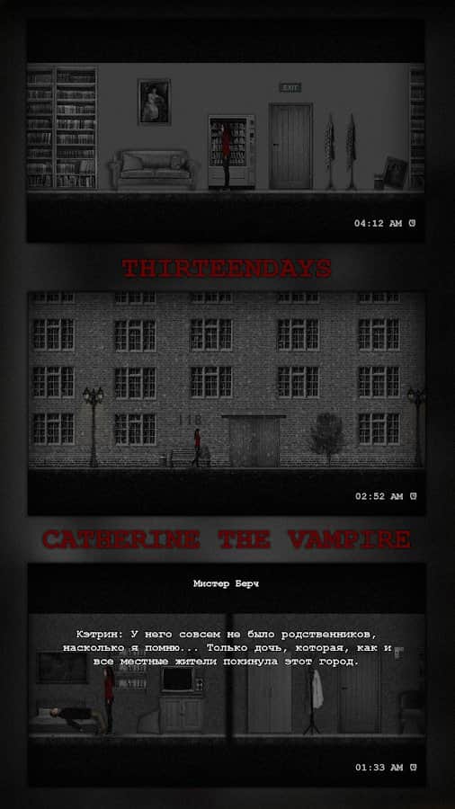 CATHERINE THE VAMPIRE – занимательный квест на андроид, где вы будете выступать в роли одинокого вампира. В этой игре вы будете играть роль вампира по имени Кэтрин которая живет в небольшом городе. Просыпаясь по ночам наша героиня, вела охоту на людей утоляя свою жажду крови. Но вот уже много лет в городе где живет Кэтрин нет не души, как будто наступил конец света, и все вымерли. В этой игре вы будете проживать одну ночь из жизни вампира выполняя различные задания и миссии. Перемещайтесь по давно известному вам городу и вспоминайте былые времена, когда в нем бурлила жизнь.