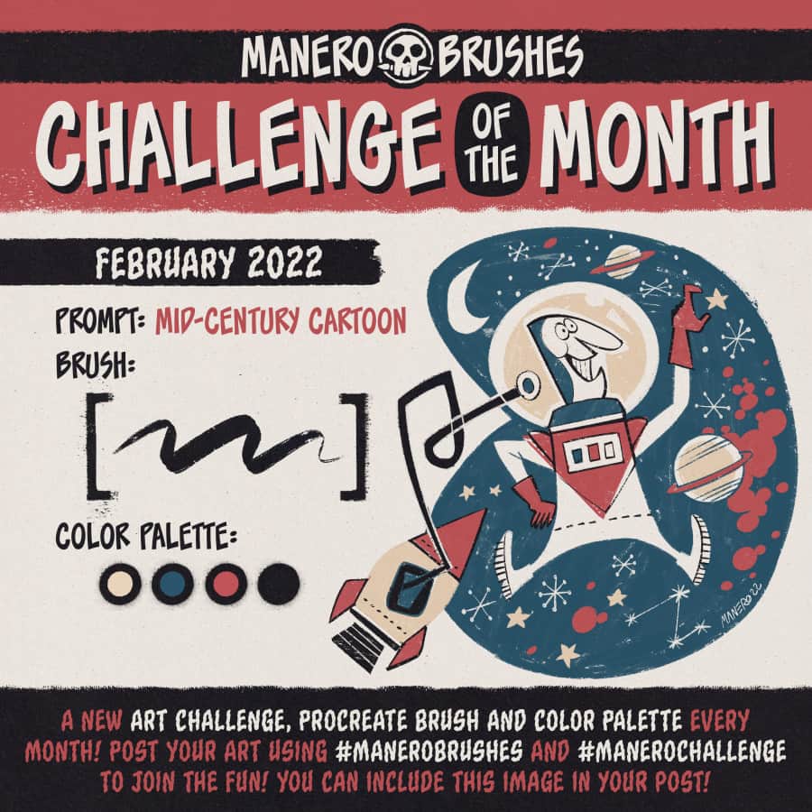 Challenge of the Month - Примете ли вы вызов в создании чего-то нового и интересного каждый месяц? Суть состоит в том, что сам автор будет давать вам набор кистей и палитру для Procreate, а также подсказки, вы в свою очередь должны нарисовать что-нибудь на основе указанной подсказки. Испытайте свои способности, узнайте способны ли вы придумать что-то креативное, попробуйте поставить себе необычный вызов и насладитесь процессом. Дополнительно, после окончания вашей работы, у вас есть возможность опубликовать её в любой соцсети с хэштегами #MANEROBRUSHES и #MANEROCHALLENGE!