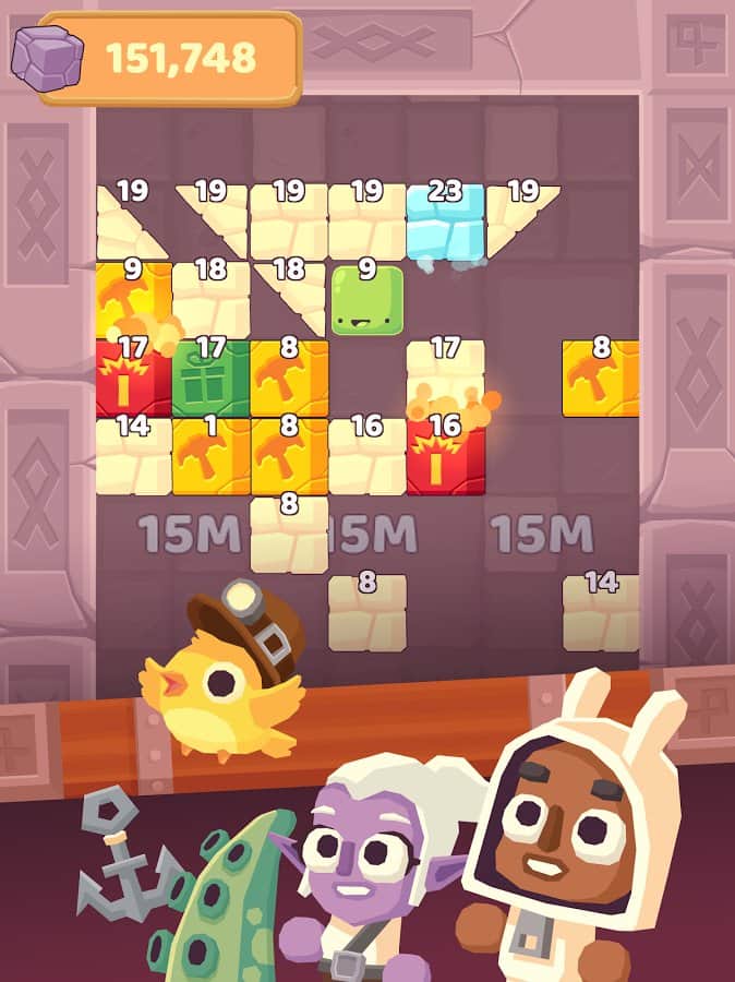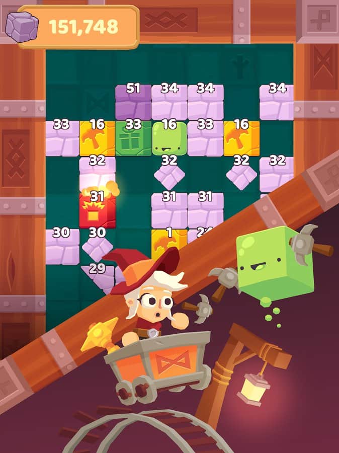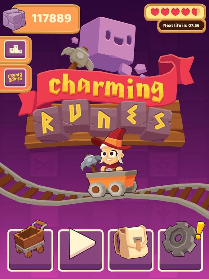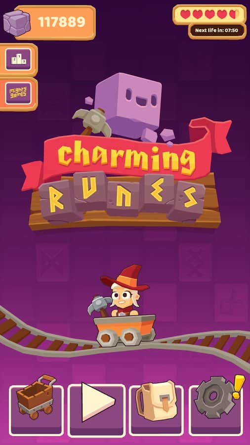 Charming Runes – игра на андроид, где вы спуститесь в шахту и будете добывать ценные руны. В этой игре вы будете управлять героем, который едет на вагонетке и подбрасывает вверх кирку, разбивающие камни и тем самым добывая полезные руны. Наш герой будет медленно двигаться по рельсам и в этот момент вам необходимо точно рассчитать траекторию полета кирки, чтобы одним ударом добыть все бонусы. Учитывайте то что кирка будет отскакивать от стен, камней и других объектов и разрушать больше преград на пути. Проходите как можно больше уровней в этой игре и получайте отличные бонусы и усиления.