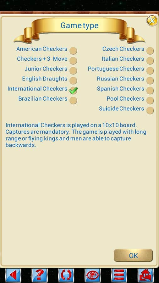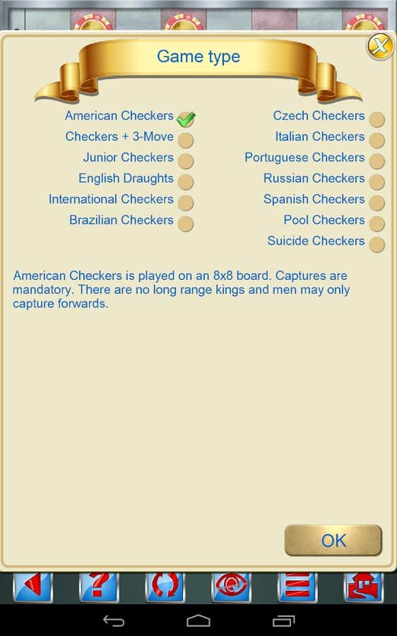 Checkers Pro V - Классическая настольно-стратегическая игра на android, целью которой захват всех фигур соперника. Эта игра на первый взгляд обманчиво проста, и несмотря на это полна хитростей и уловок.История игры начинается аж в 1600й года до нашей эры, похожая игра упоминается в работах писателя Гомера и Плато. В игре собраны все возможные вариации шашек (около десяти штук ) и более чем двадцати уровней с увеличением уровня сложности.