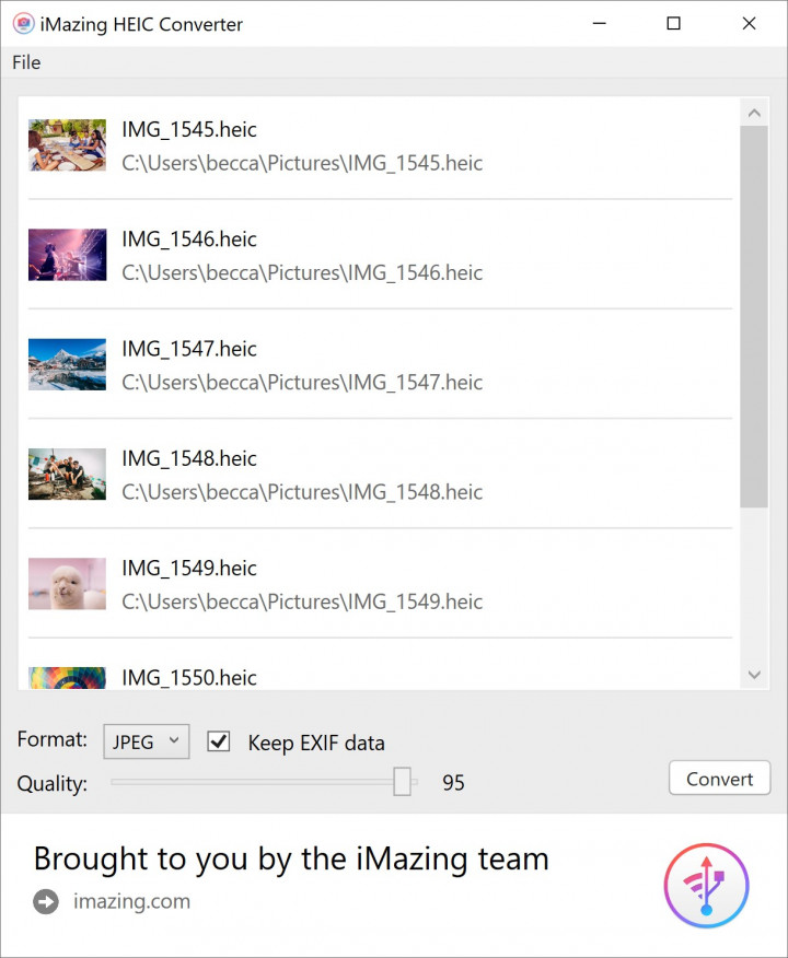 Кроме того, вы можете установить плагин-конвертер, например, iMazing HEIC Converter, который распространяется бесплатно. После установки и запуска, вам достаточно будет перетащить файлы в открывшееся окно, выбрать желаемое качество (рекомендуем 100%) и формат конечного изображения (jpg или png). Далее нажимаем “Конвертировать” и выбираем папку, куда будут сохранены конечные изображения.