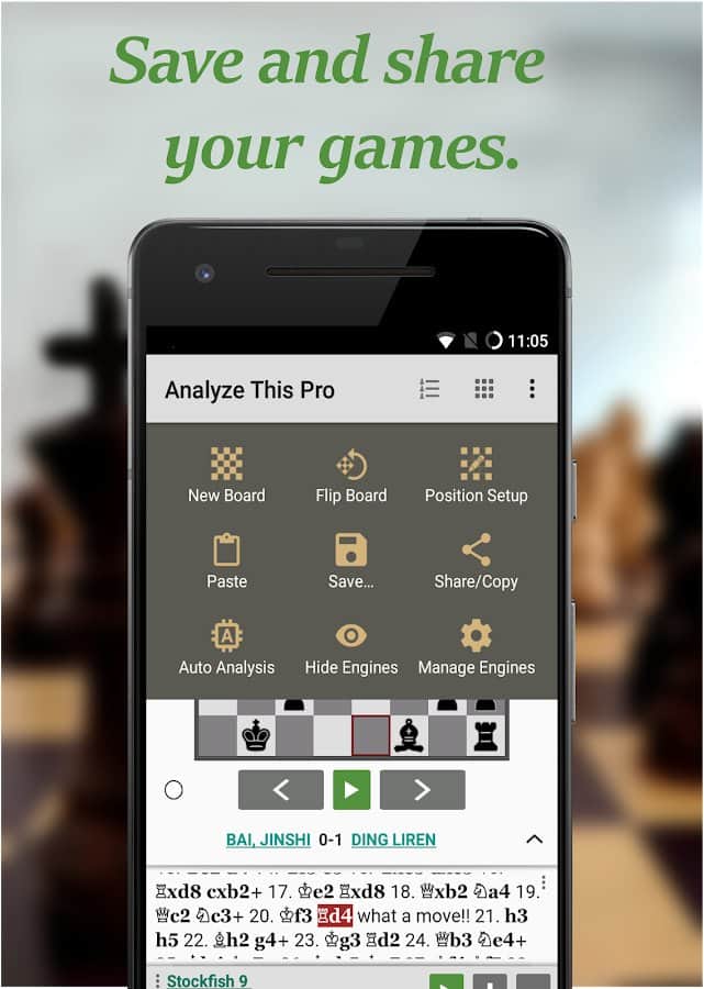 Chess - Analyze This - приложение на Android для анализирования своей игры в шахматы. С помощью этой утилиты вы сможете узнать лучший ход в текущей позиции, которые подскажут сразу несколько различных движков. Загрузите и анализируйте ваши игры в PGN формате. Сохраняйте ходы и вариации. Теперь вам не нужен для этих целей компьютер. Наслаждайтесь шахматами на Android вместе с Analyze This Pro как никогда раньше.