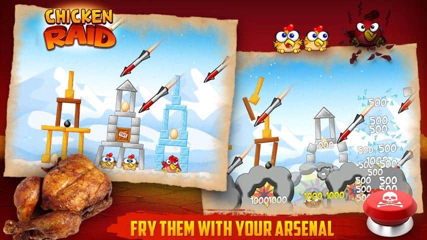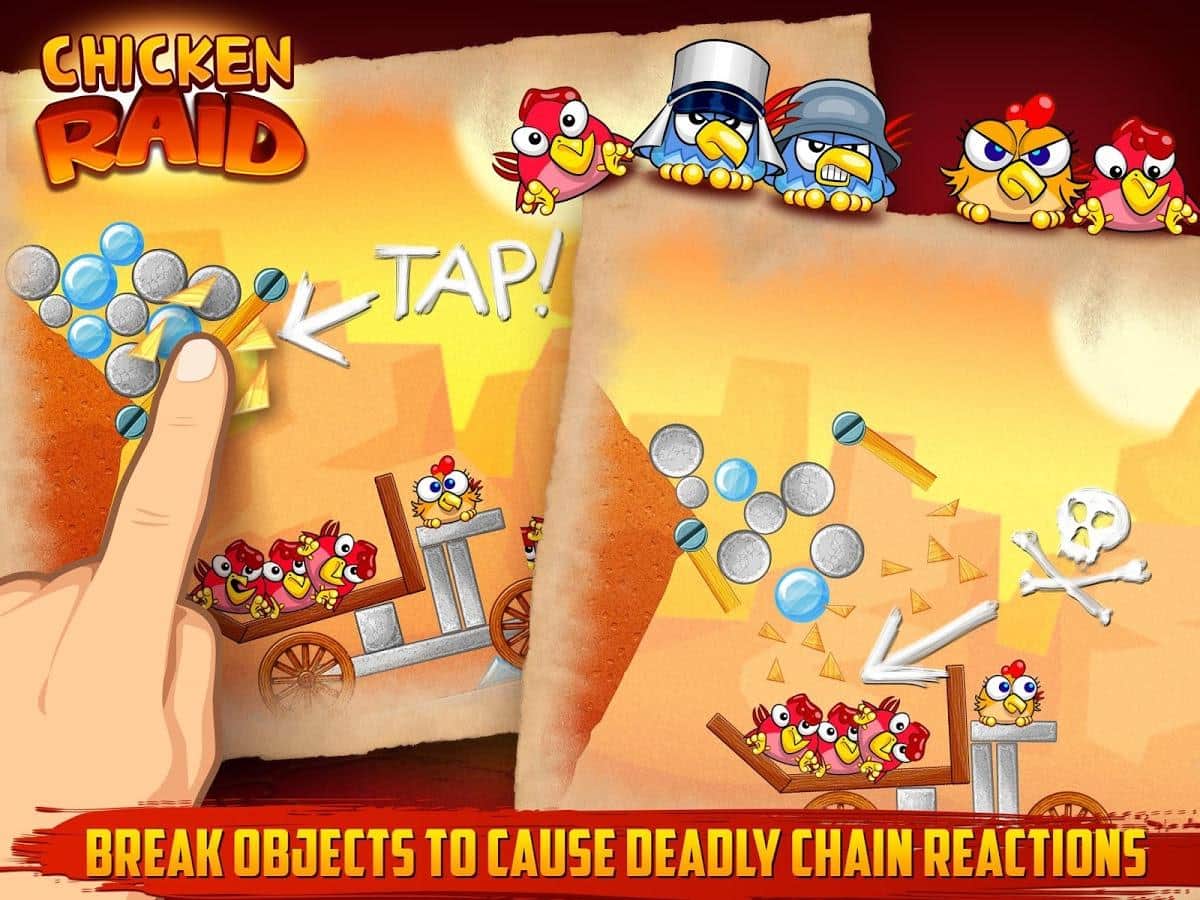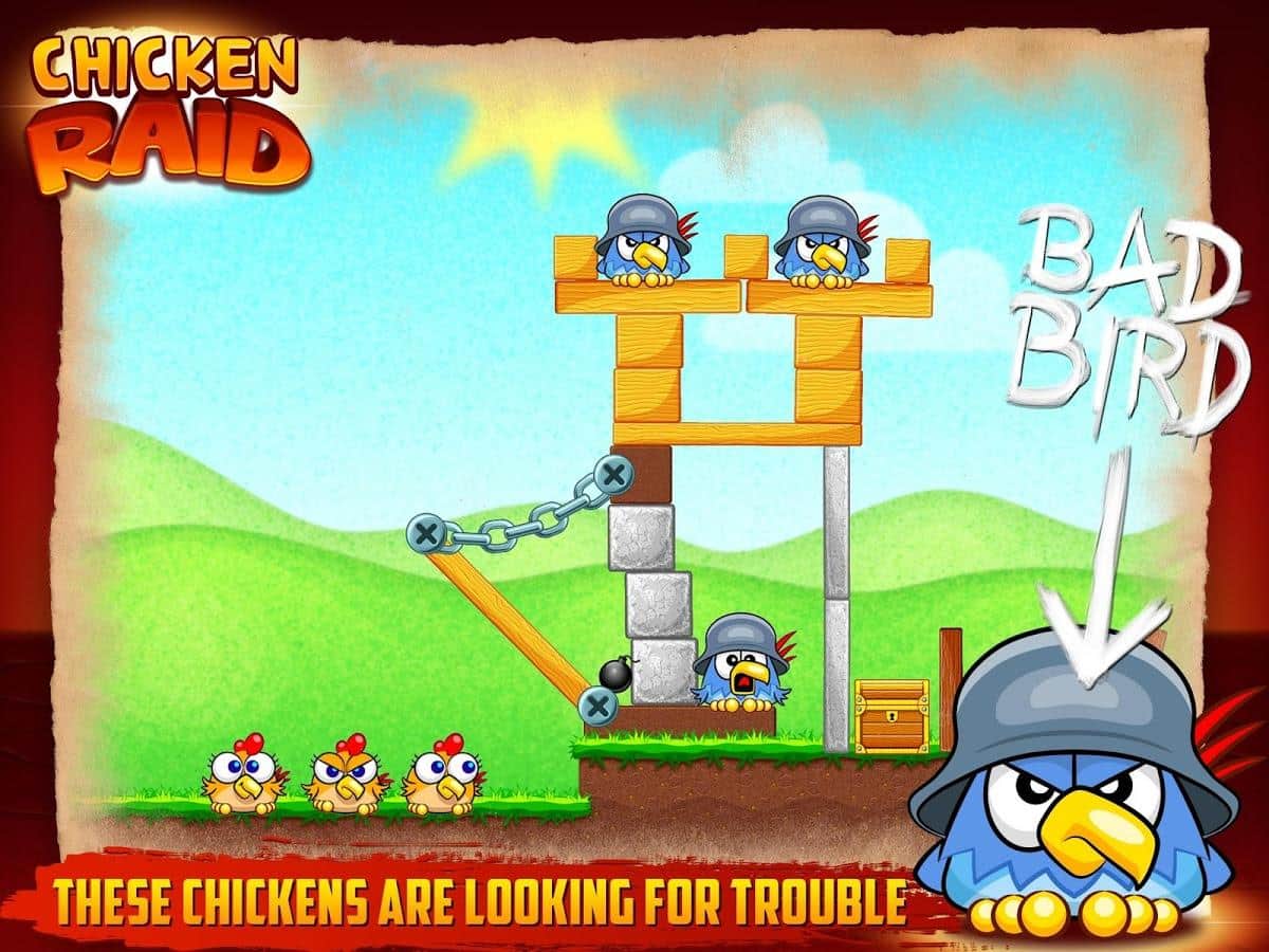 Chicken Raid - яркая аркада для андроид - в своем роде клон Angry Birds. Шайка или банда, называйте как хотите, самоуверенных и наглых цыплят атаковала вашу территорию. Эти хулиганы ведут себя отвратительно и совсем не собираются уходить. Но и вы не промах! Находите слабые места в строениях, на которых веселятся цыплята и постарайтесь попасть туда, тем самым вызвав цепную реакцию и разрушив конструкцию, а вместе с ней и раздавив цыплят. Используйте бомбы и со временем разблокируйте дополнительные интересные материалы, которые добавят красок в геймплей! 96 уровней уникального сценария, комиксов и "Песни цыплят".