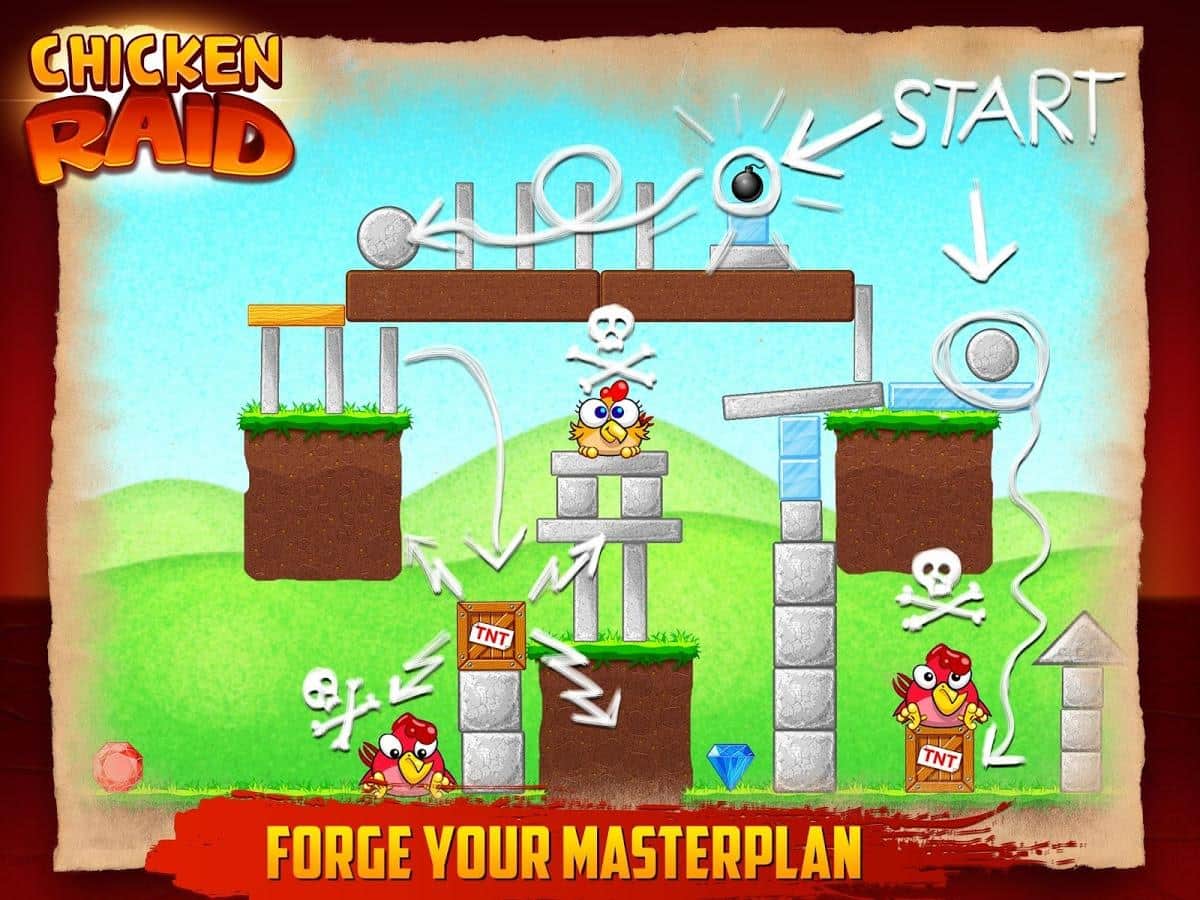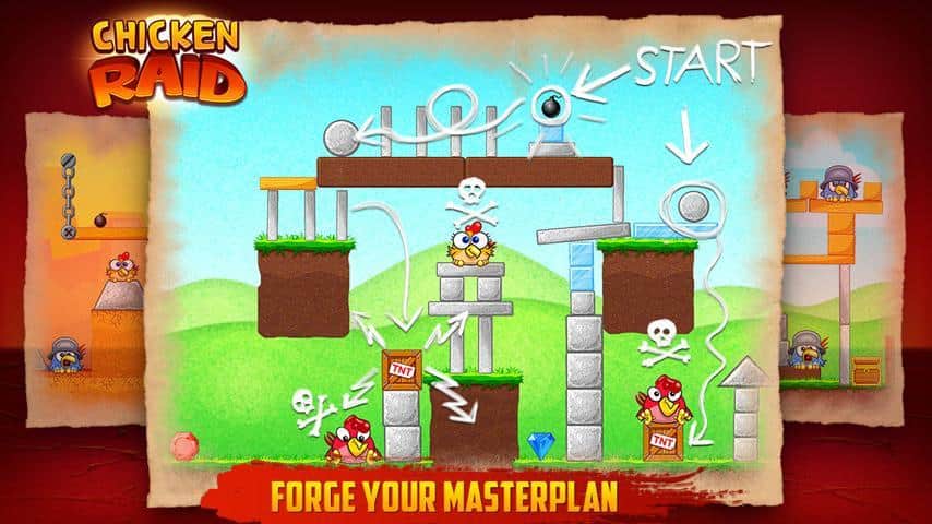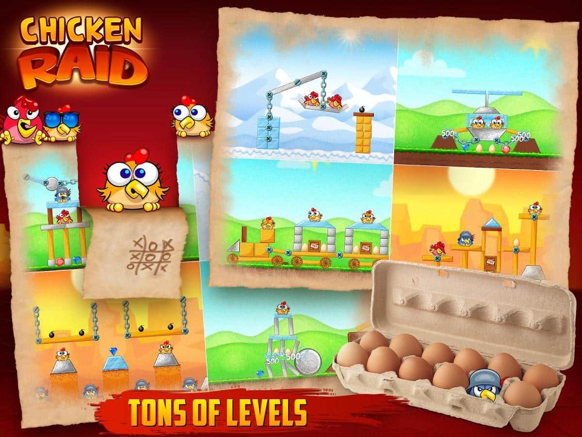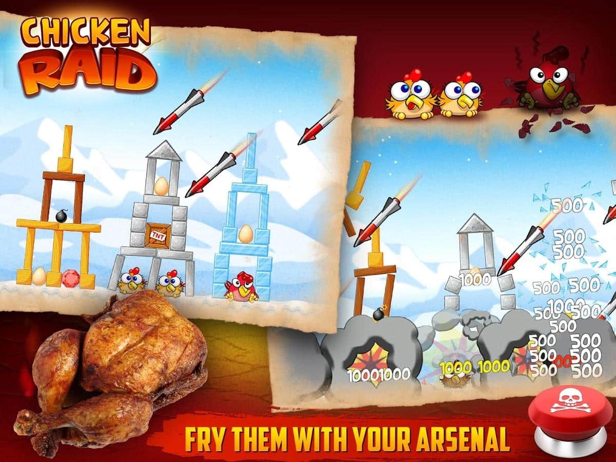 Chicken Raid - яркая аркада для андроид - в своем роде клон Angry Birds. Шайка или банда, называйте как хотите, самоуверенных и наглых цыплят атаковала вашу территорию. Эти хулиганы ведут себя отвратительно и совсем не собираются уходить. Но и вы не промах! Находите слабые места в строениях, на которых веселятся цыплята и постарайтесь попасть туда, тем самым вызвав цепную реакцию и разрушив конструкцию, а вместе с ней и раздавив цыплят. Используйте бомбы и со временем разблокируйте дополнительные интересные материалы, которые добавят красок в геймплей! 96 уровней уникального сценария, комиксов и "Песни цыплят".