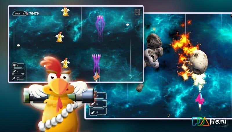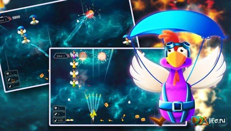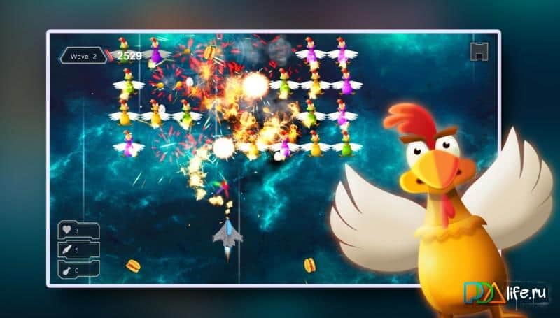 Chicken Shot - Space Warrior – станьте пилотом небольшого космического корабля, который атаковали инопланетные цыплята. На нашу планету надвигается угроза в виде космических цыплят, вашей задачей будет не дать врагам прорвать вашу оборону. Приготовьтесь к эпическим битвам с цыплятами, которые обрушивают поток космических яиц на ваш корабль. Сражайтесь с коварными противниками и уничтожайте их с помощью мощного оружия, не давая им подбить ваш корабль. Перемещайте свой корабль влево и вправо, выполняя маневры, обходя летящие на вас космические яйца, которые могут отнять у вас жизни при попадании по кораблю. Собирайте специальные бонусы и улучшайте свой корабль либо приобретая новый.