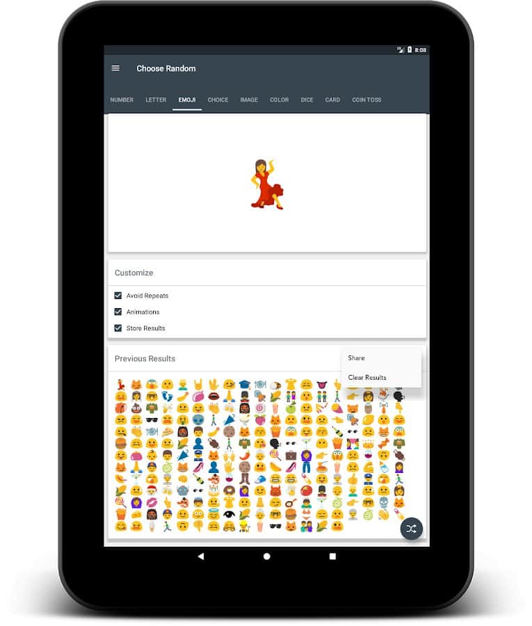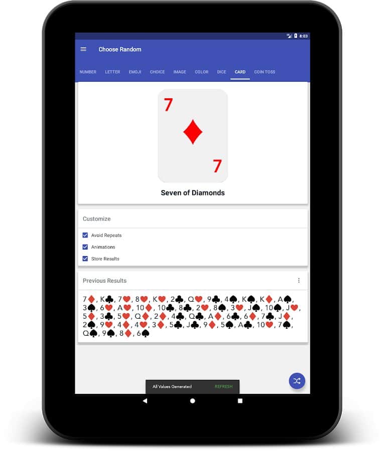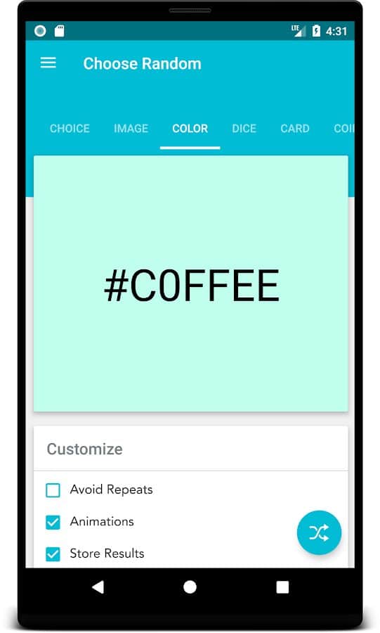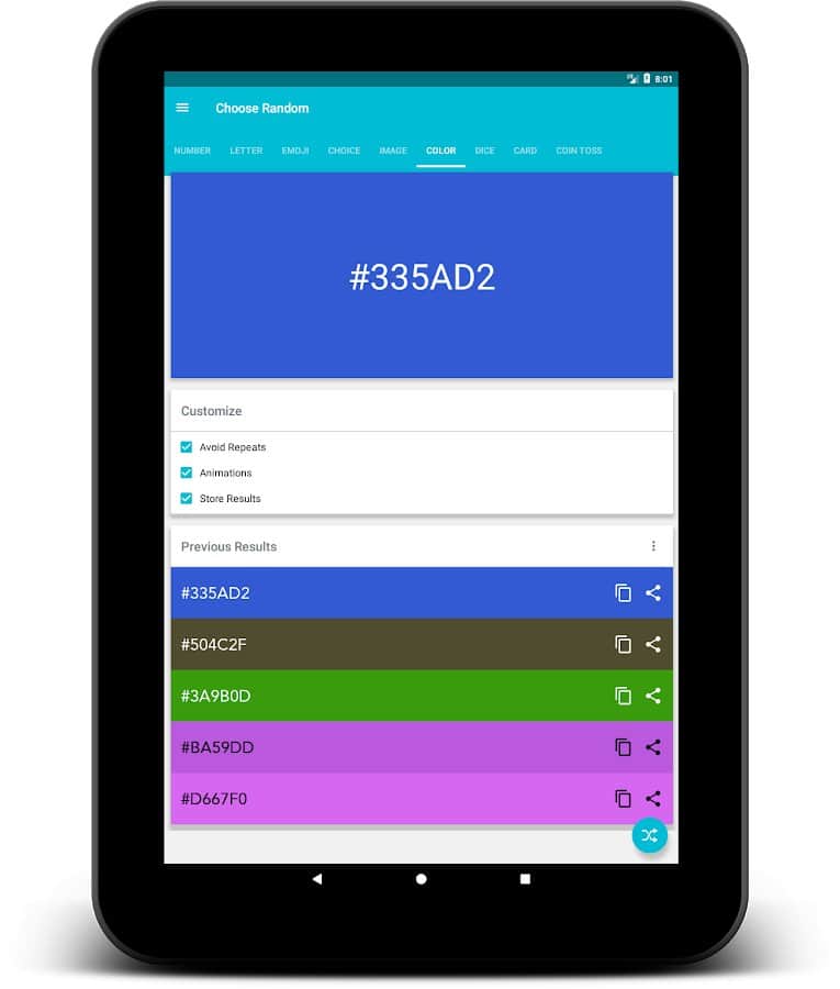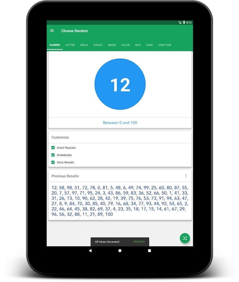 При помощи интуитивно понятного интерфейса программы Choose Random можно быстро и удобно сгенерировать любой набор чисел, букв, изображений, цветов, смайликов, слов из списка, игровых костей или карт из колоды, орла или решку и др. Для каждой указанной категории есть красивая анимация и множество эффектов. А такая функция, как сохранение и импорт данных позволит вам поделиться полученными результатами со своими друзьями и близкими через различные каналы связи, в частности социальные сети. Изображения легко можно установить в качестве обоев на экран смартфона. Приложение имеет отзывчивую техподдержку, быстро реагирующую на возникшие вопросы по использованию.