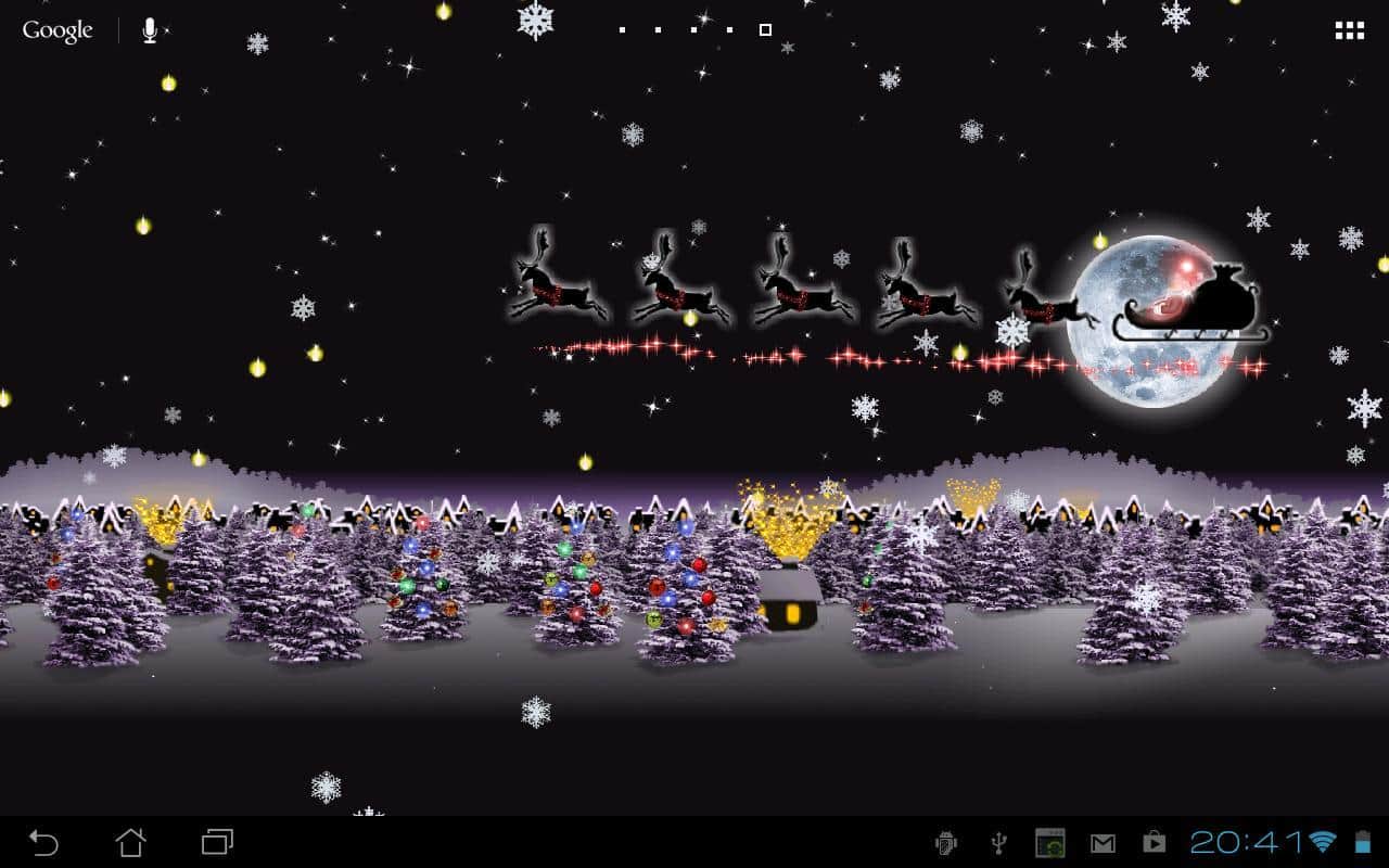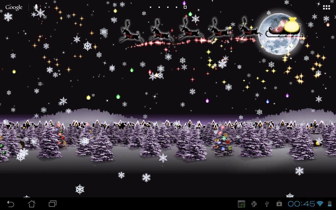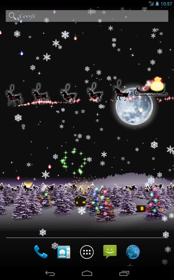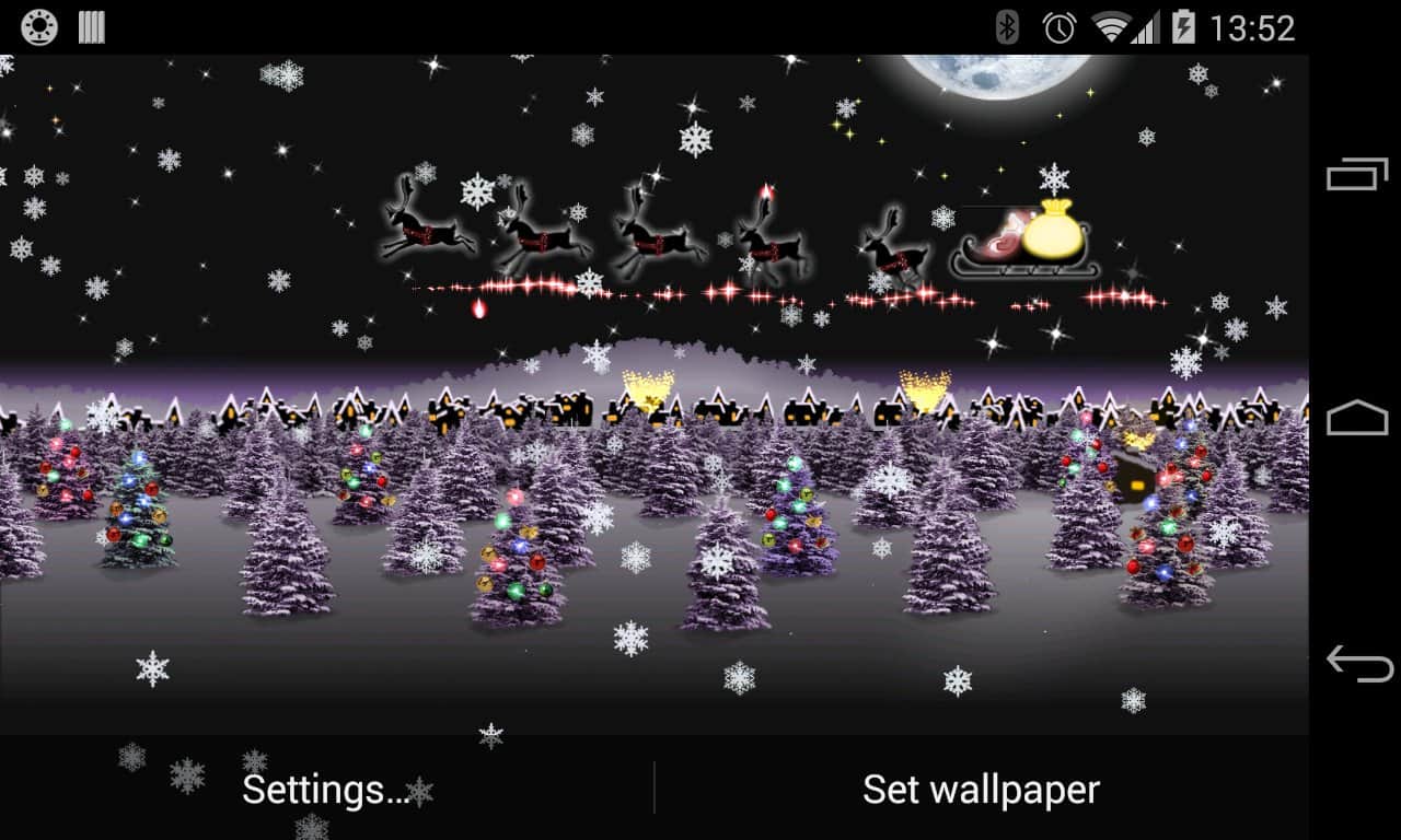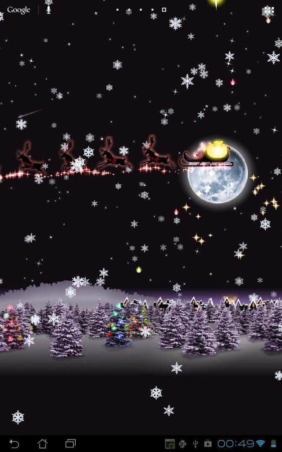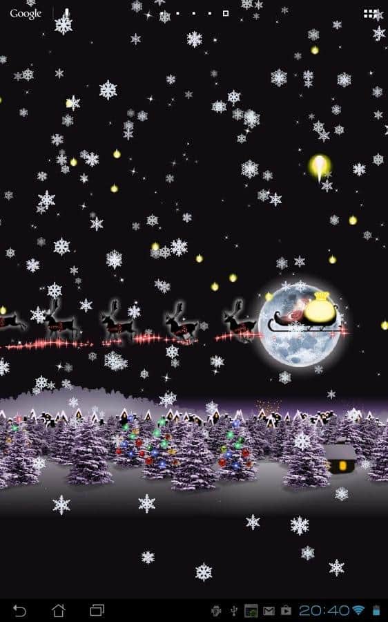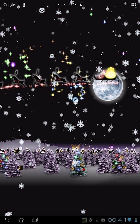 Christmas Live Wallpaper HD – упряжка с верными оленями Санты мчится по ночному небу. Вот таким нехитрым образом Он летит к детям дарить новогоднее настроение и подарки. Встряхнув телефон будут играть новогодние колядки. Отличная рисовка и плавная анимация безусловно порадует всех обладателей этих прекрасных новогодних обоев. Живые бои используют гироскоп телефона, благодаря чему вам будет обеспечен 3D параллакс эффект.