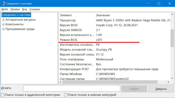 Здесь в строке Режим BIOS вы увидите отметку “Legaсy” — она будет обозначать устаревшую версию технологии загрузки или собственно UEFI.