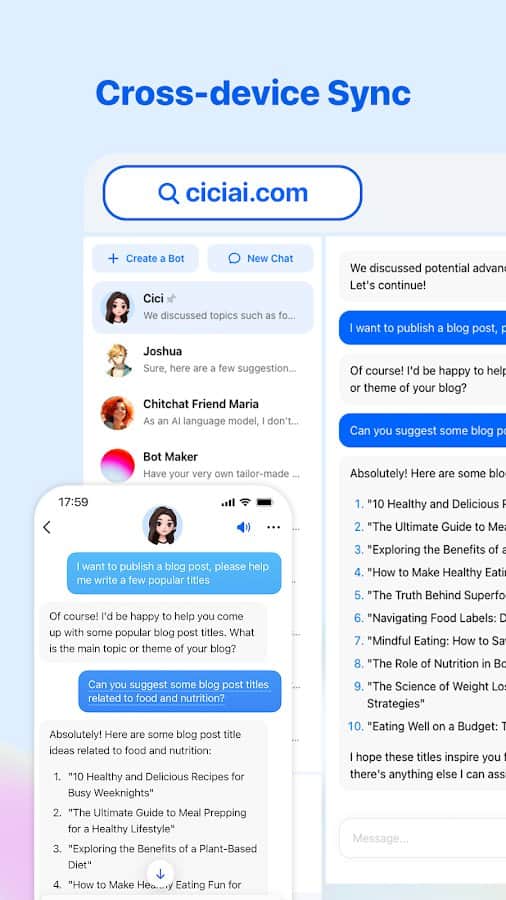 Cici - это ваш личный помощник на основе искусственного интеллекта, который предлагает максимально умного бота для удобства и эффективности в вашей жизни. Это уникальное приложение предназначено для пользователей, которые хотят иметь надежного и интеллектуального помощника, способного помочь в различных ситуациях. Бот предлагает широкий спектр возможностей, которые ограничены только вашими потребностями и воображением. Вы можете использовать Cici в учебе, чтобы получить помощь в решении задач, подготовке к экзаменам или просто расширить свои знания. Он также может быть полезным для удовлетворения вашего любопытства, предоставляя информацию по различным темам и отвечая на ваши вопросы. Благодаря своей адаптивности, Cici способен адаптировать стиль общения к вашим особенностям, чтобы обеспечить комфортное и естественное взаимодействие.